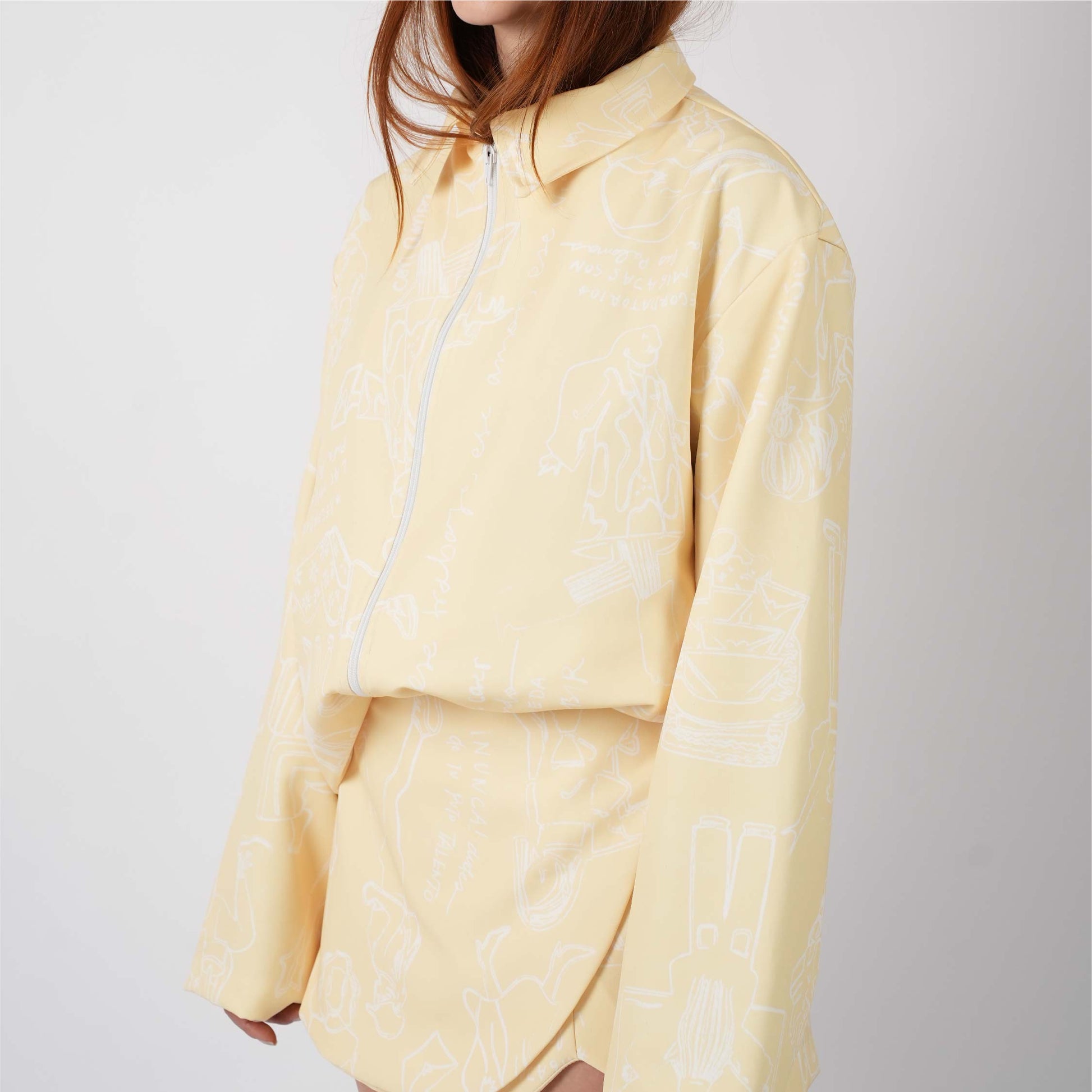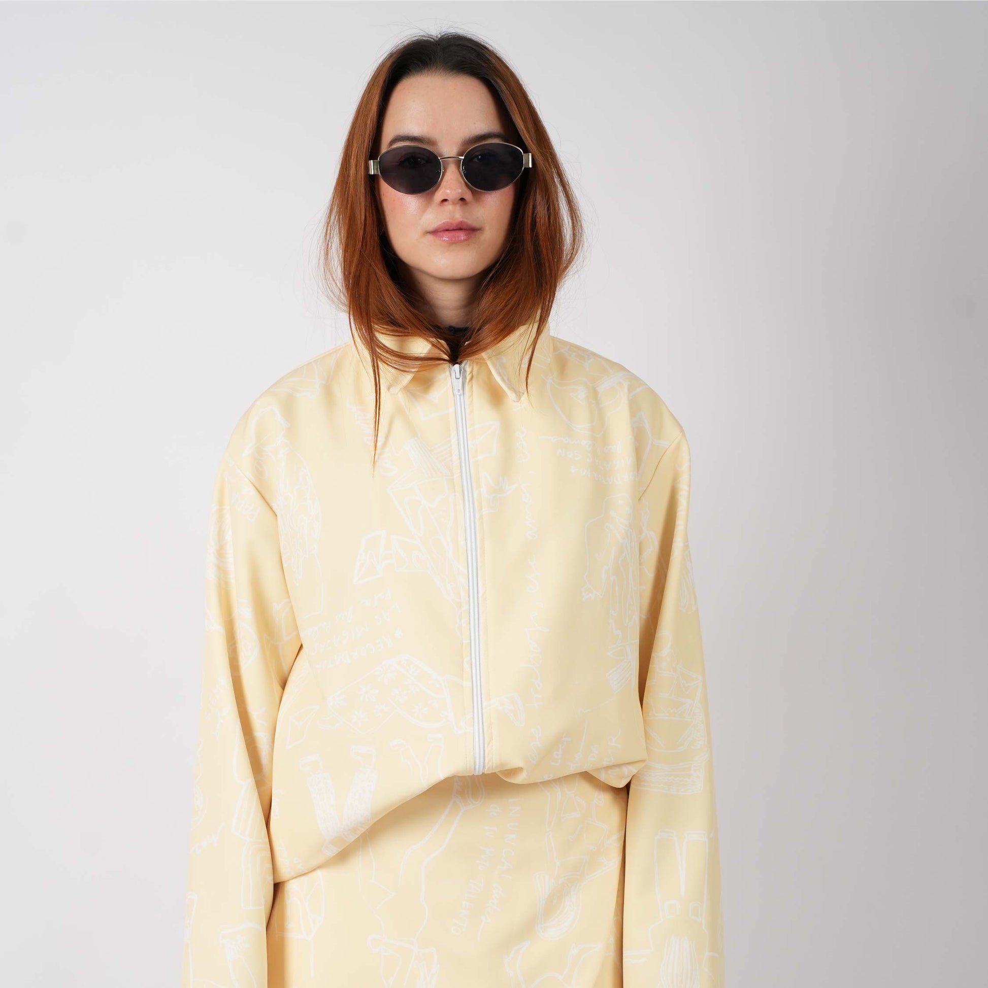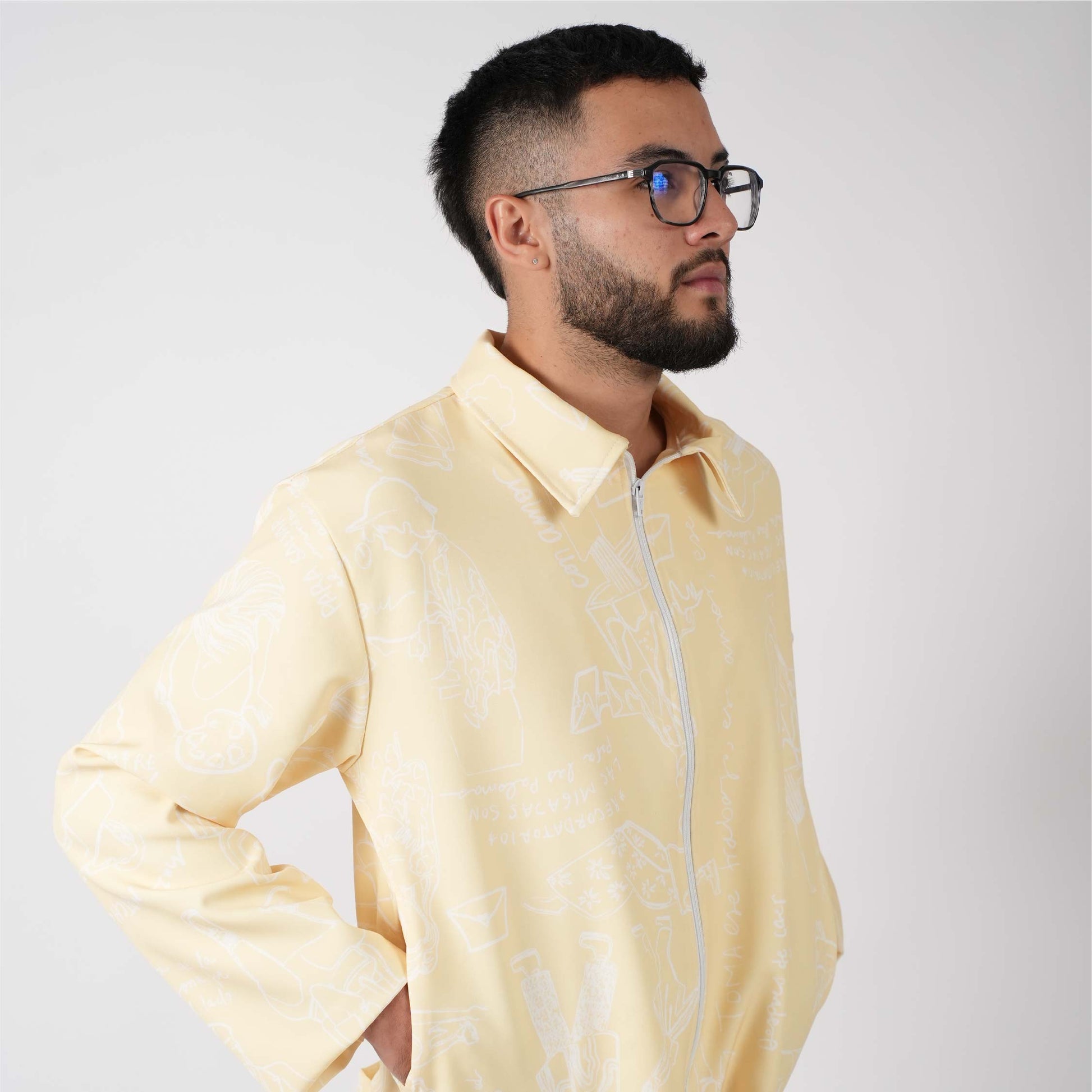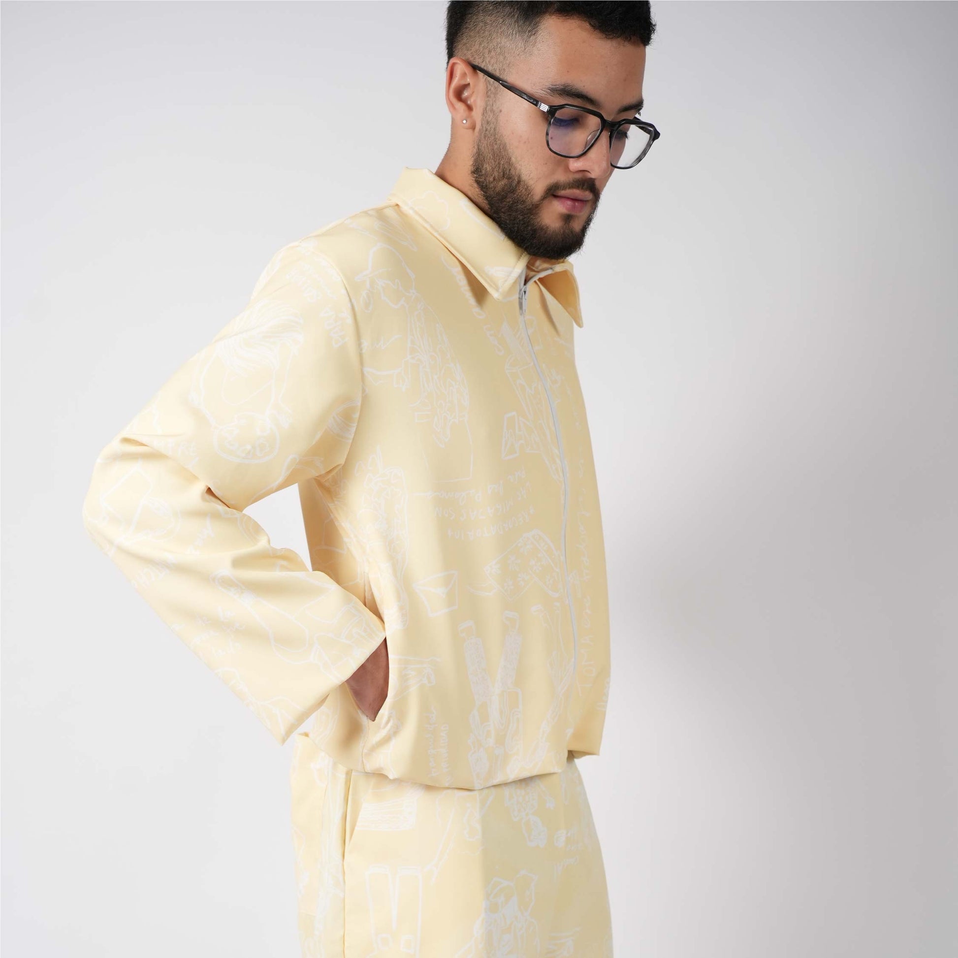 Chaqueta tipo trench en corte recto, con el diseño sublimado de la carta a un desconocido en tono amarillo mantequilla e ilustraciones en blanco. Tela genova, liviana perfecta para un look formal.