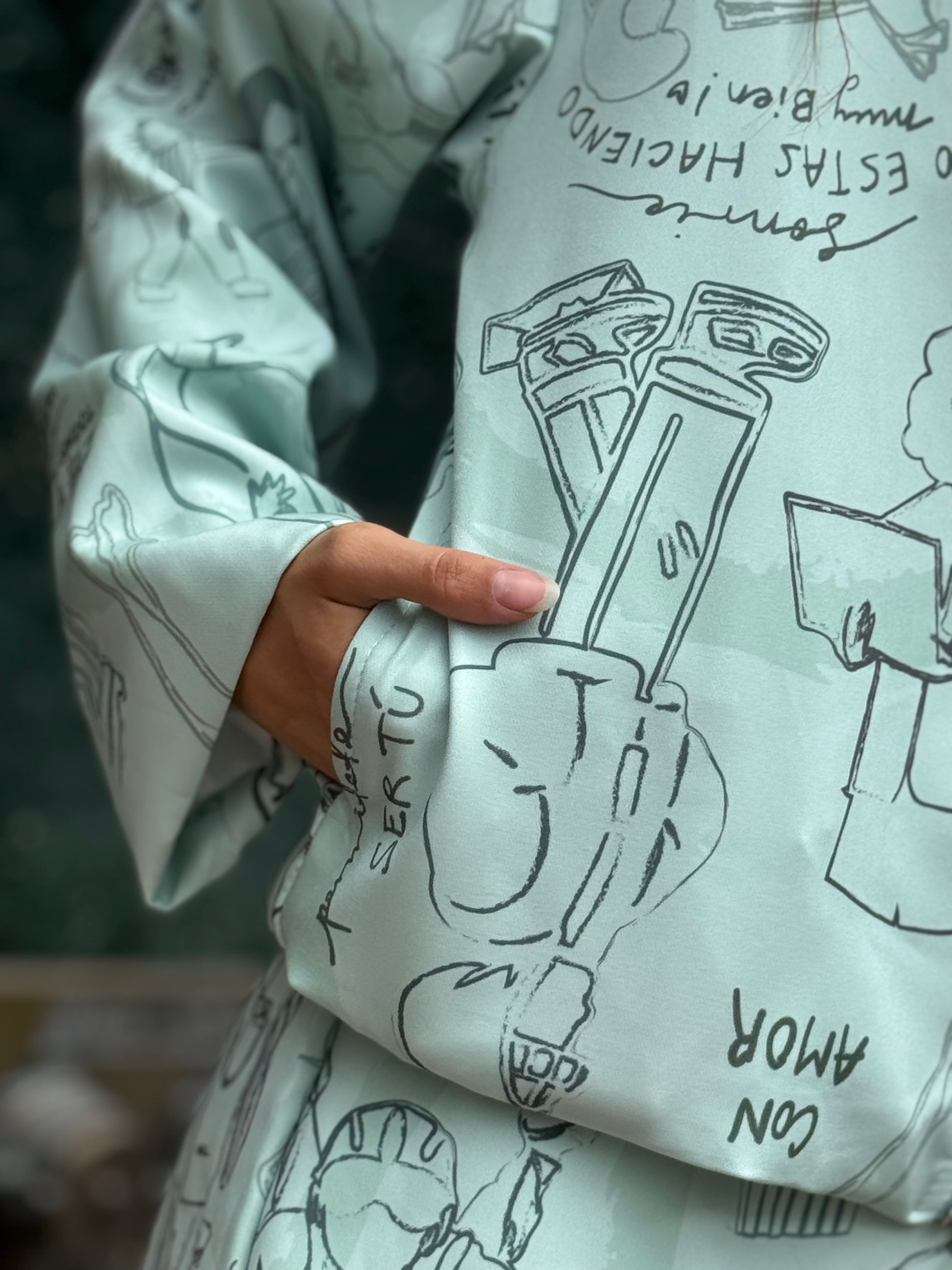 Chaqueta tipo trench en corte recto, con el diseño sublimado de la carta a un desconocido en tono Verde menta e ilustraciones en diferentes tonos verdes. Tela genova, liviana perfecta para un look formal.