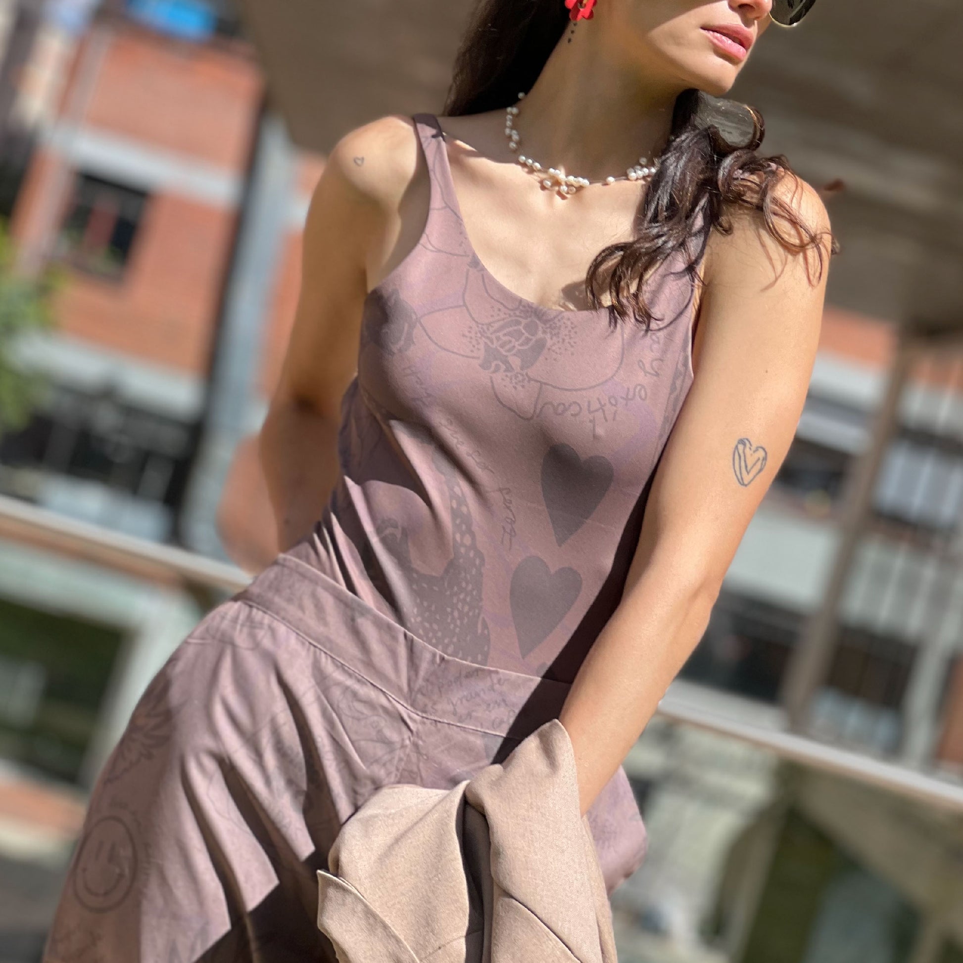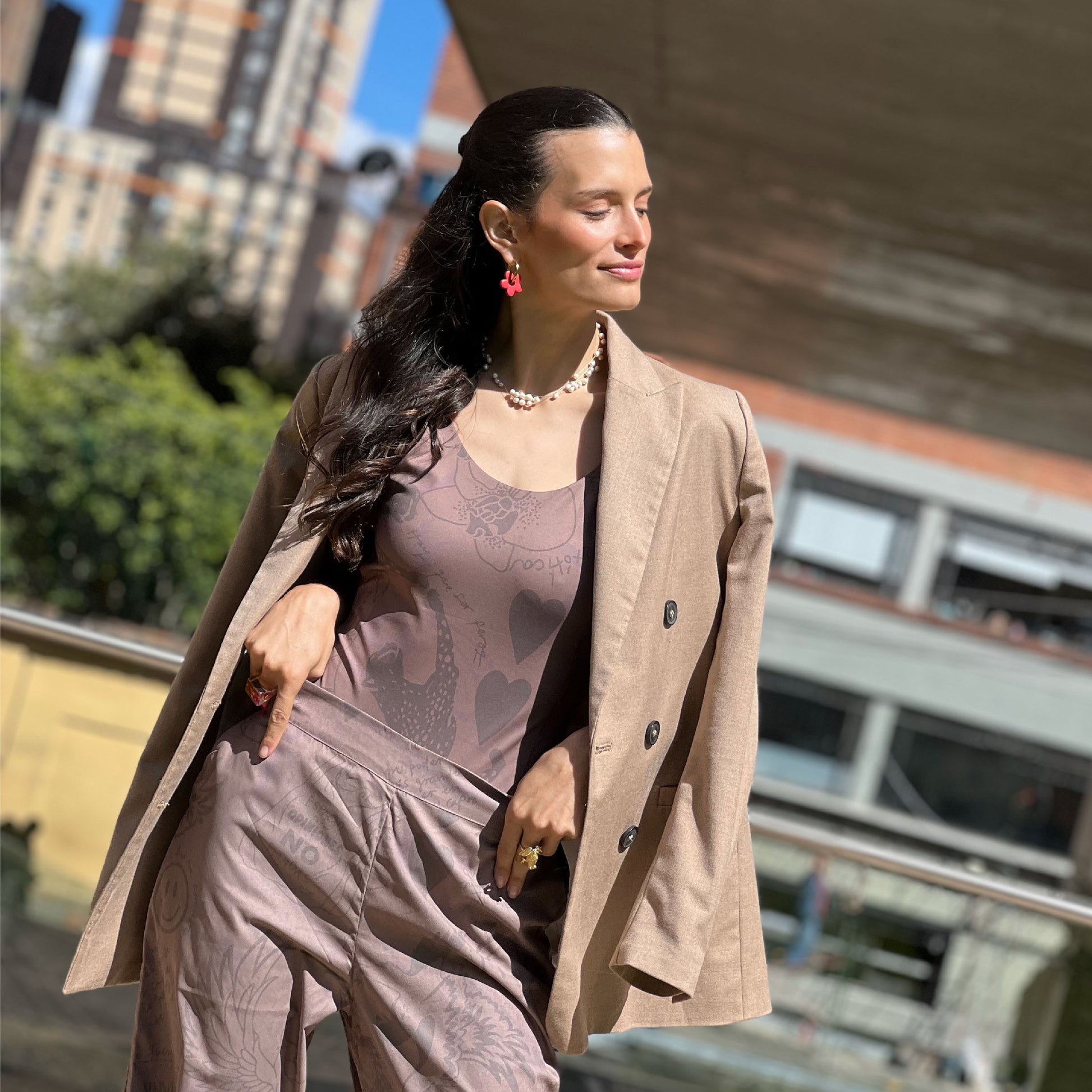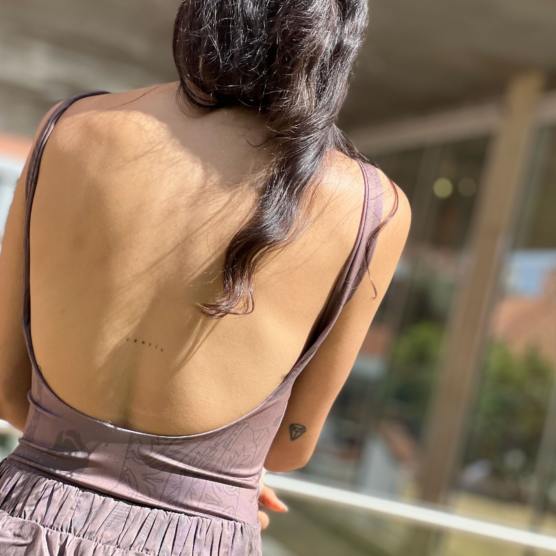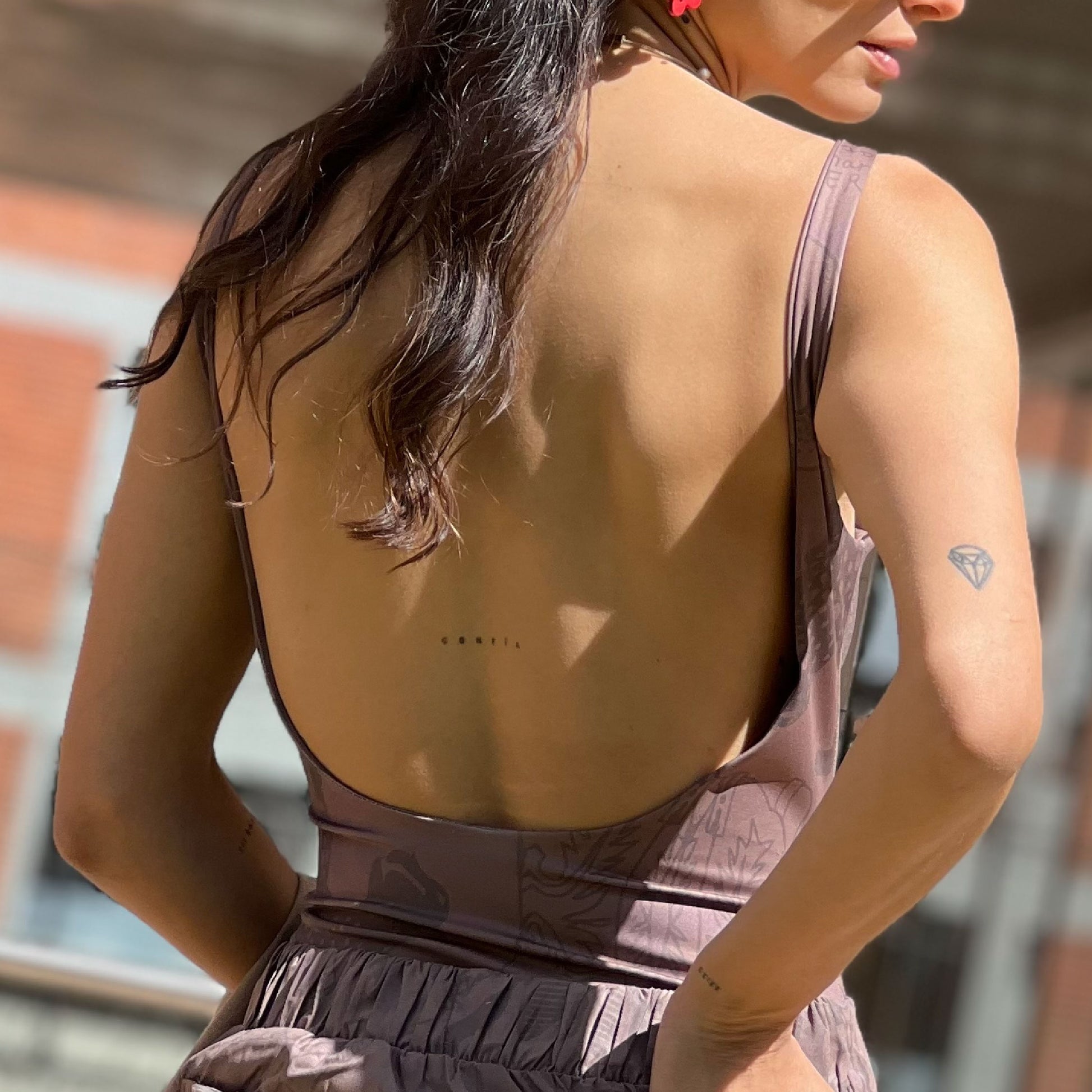 Body en tela Atalaya con sublimación de la carta de amor propio. tiene un escote en la espalda tipo U y marquilla de PVC en la espalda. Su composición es 81% poliéster 19% elastano y el panty es tipo tanga.