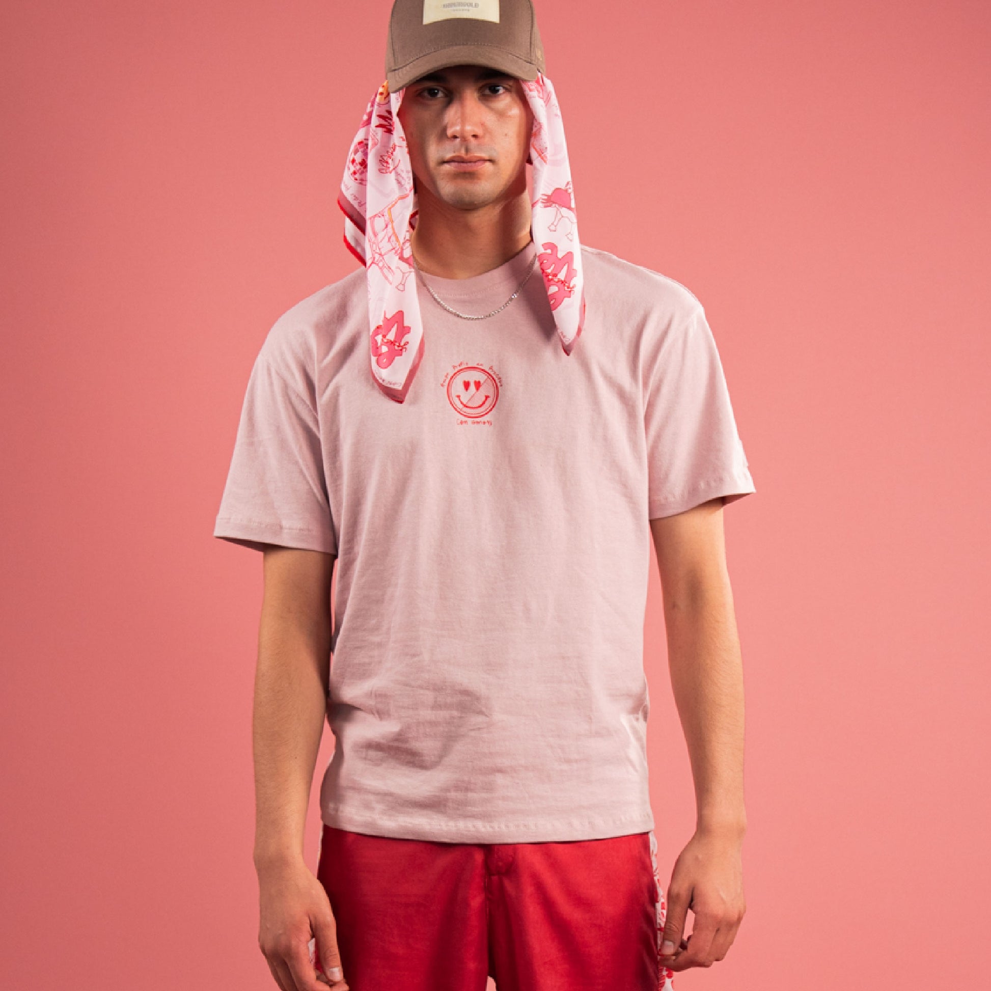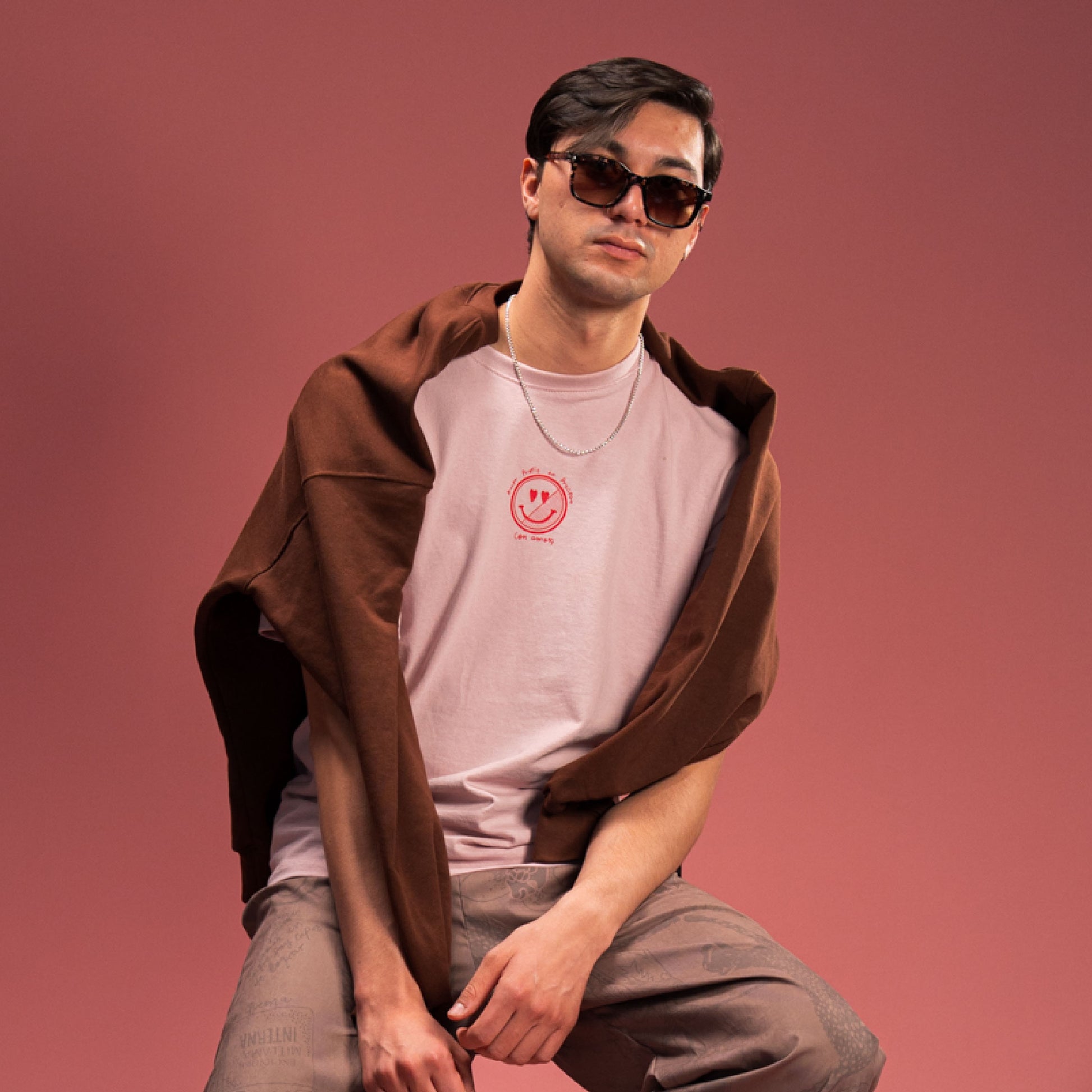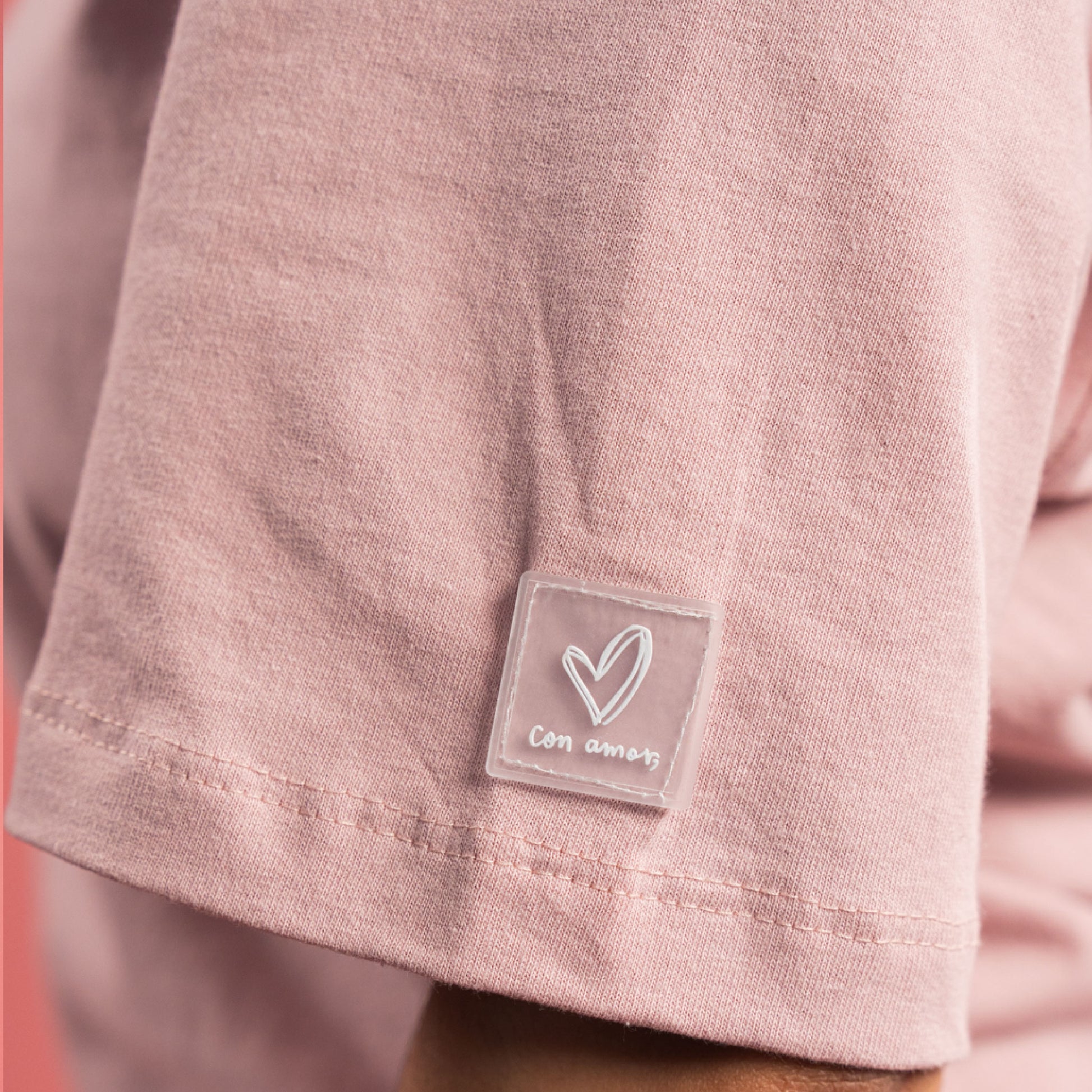 Camiseta oversized color palo rosa con estampados de la colección en la espalda y el logo en la parte delantera. Marca en relieve exterior en la manga