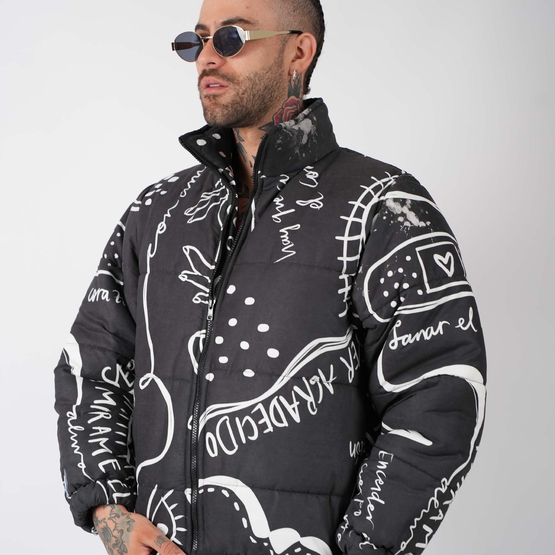 Chaqueta Puffer negra con la ilustración de una carta de amor que nunca entregué, acolchada en guata de alto calibre, perfecta para los días frios.