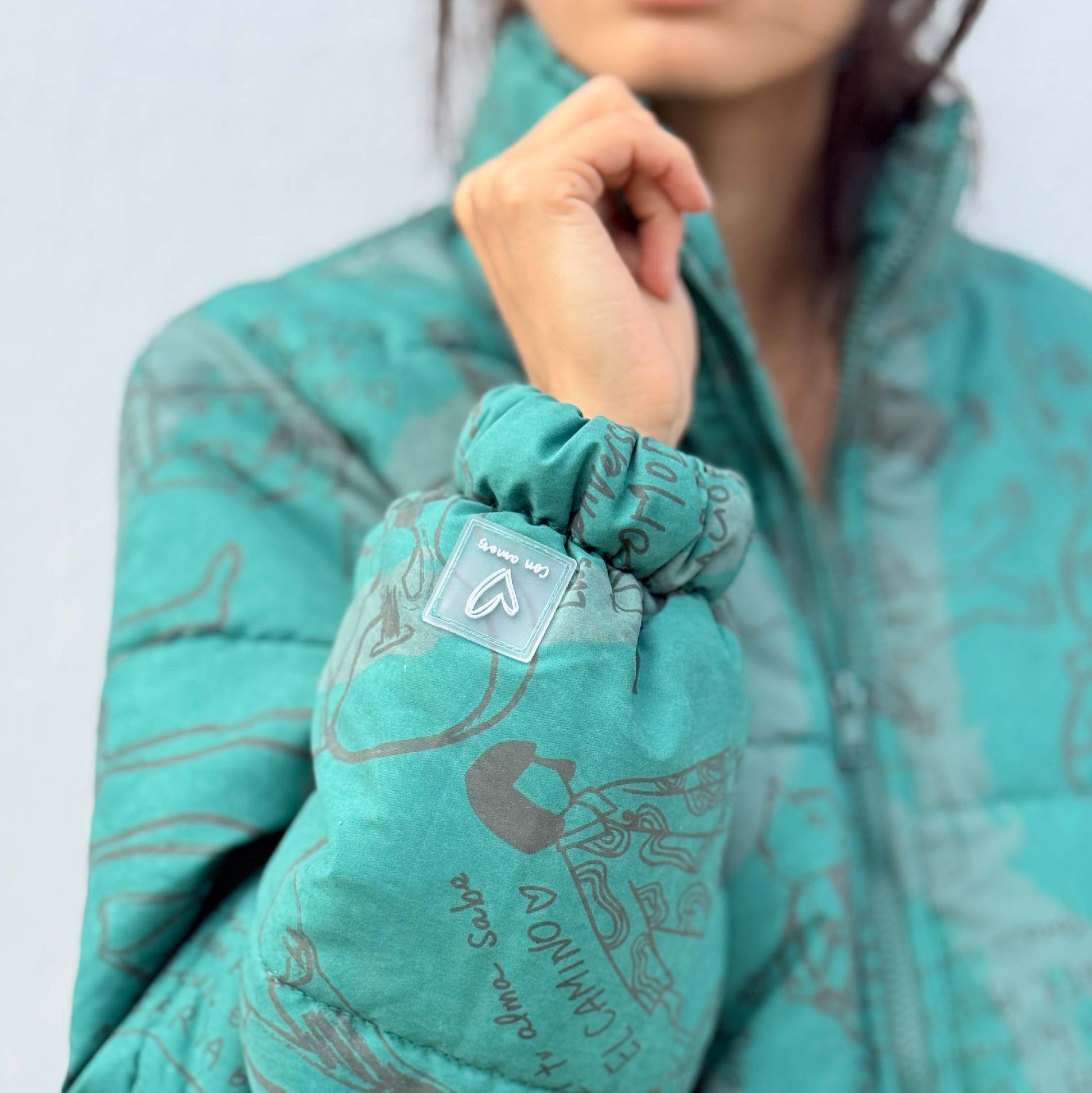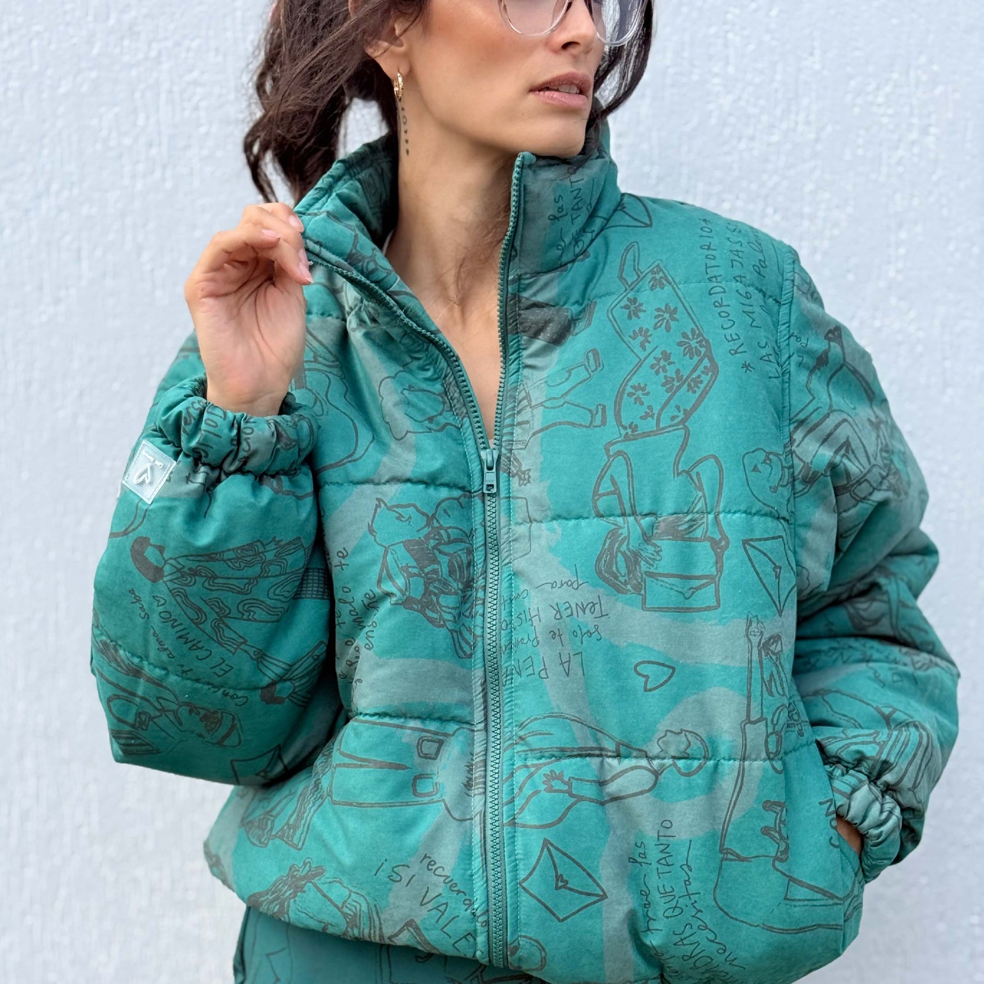 Chaqueta en Puffer con la ilustración de la carta a un desconocido impresa y sensación de piel de durazno. Su base es verde esmeralda y con letras e ilustraciones en verde oscuro. Es apto para llevar en climas fríos. Su silueta es oversized, y tiene marquilla en relieve en la manga derecha. Puedes llevarla en set con lo Short o pantalón verde esemeralda.