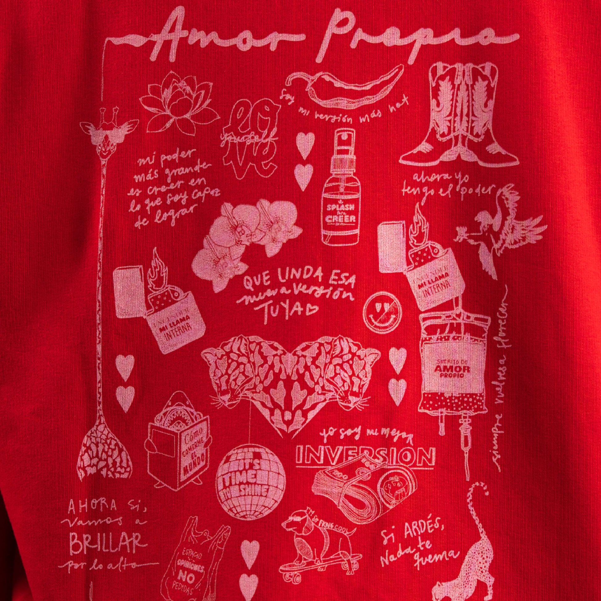 Cuello redondo color Rojo con logo estampado adelante en el pecho y atrás diseño de la colección Rosado. Viene con marquilla exterior en el frente abajo. Muy fácil de combinar con toda nuestra colección. Hecha en Burda de gramaje medio.