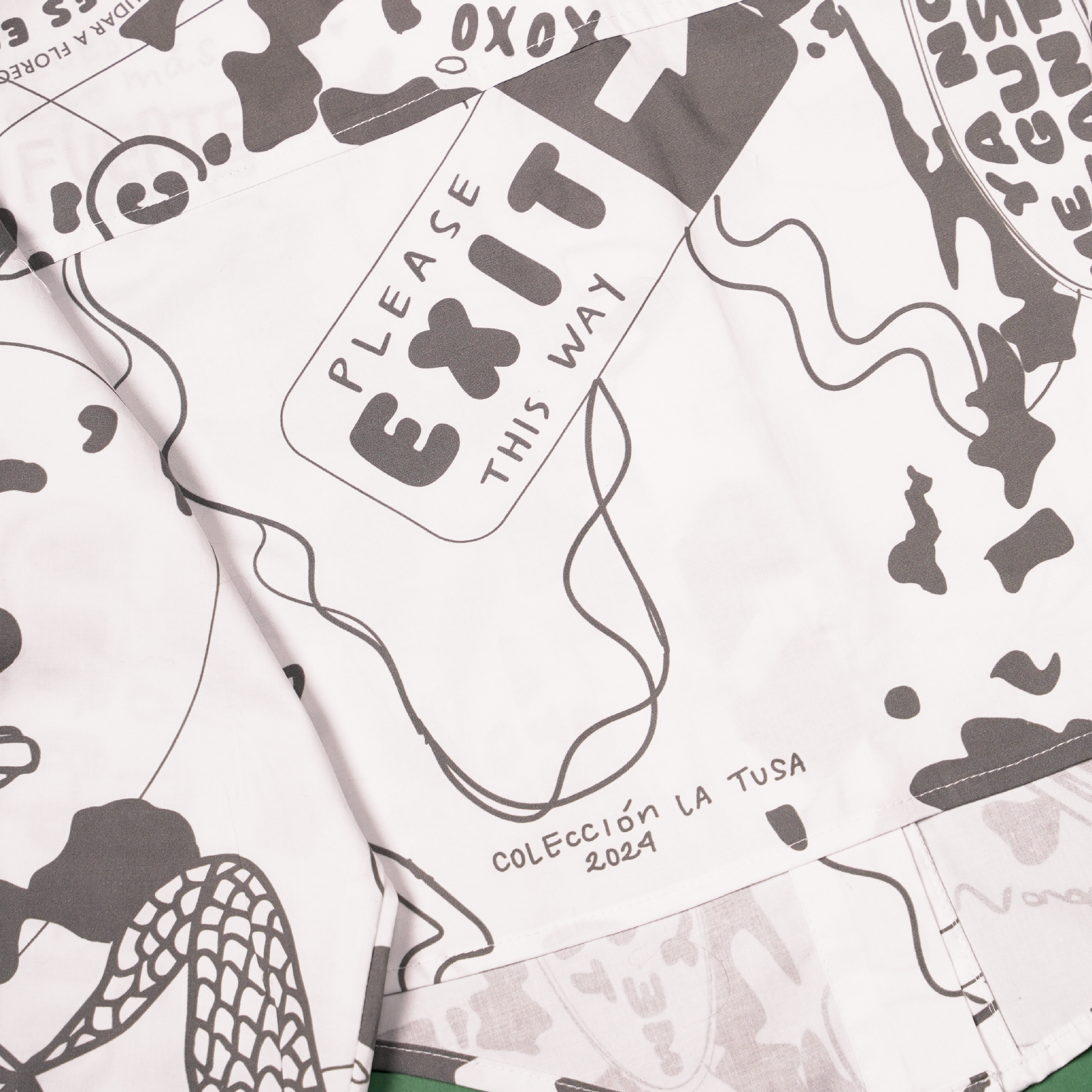 Camisa con corte frontal tipo Corsé y corte recto en la espalda. Con base blanco y con diseños de la carta impresa en Gris. Marquilla en relieve en la parte delantera abajo.