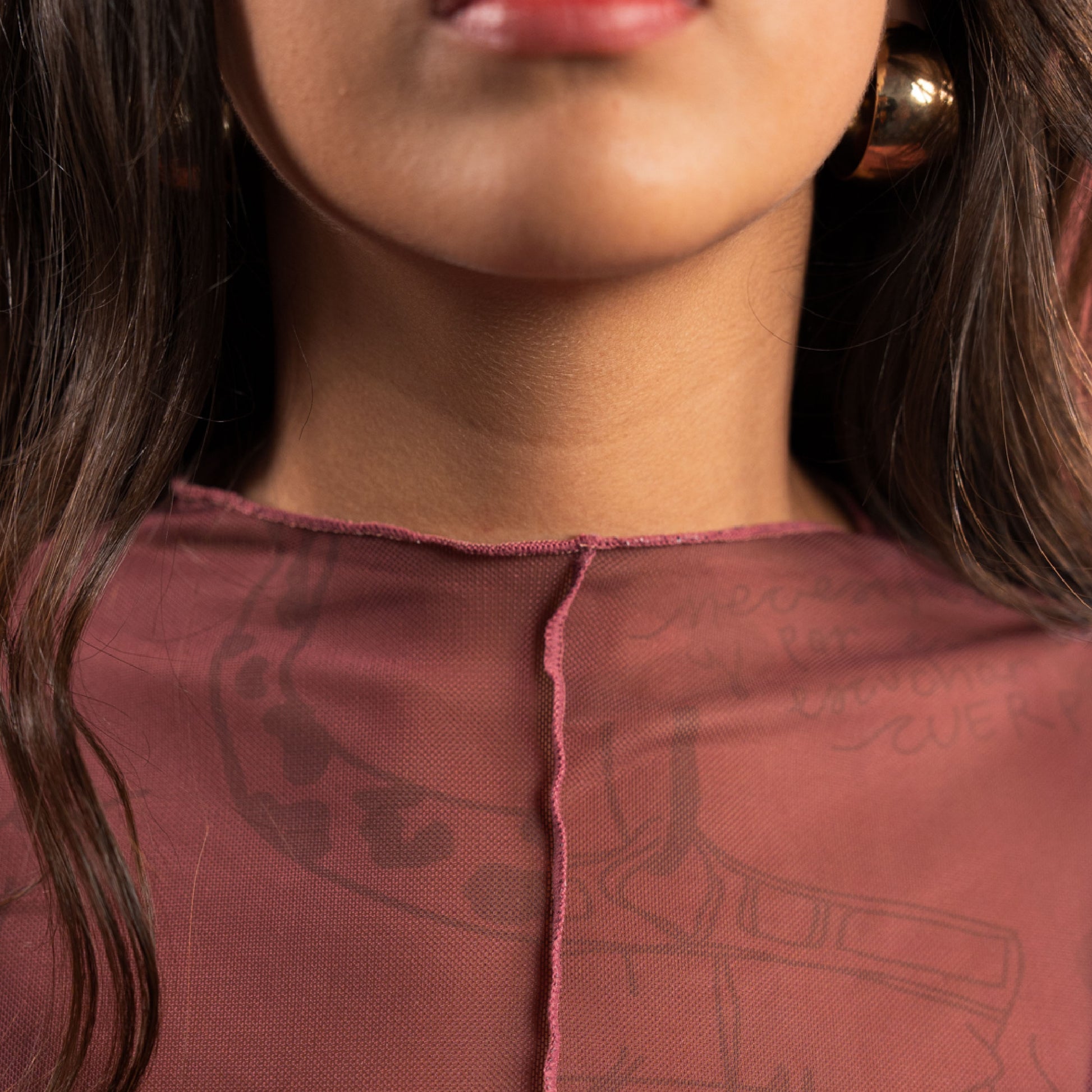 Malla tipo crop top con sesgo frontal y corte recto. Con diseños de la carta impresa en café.
