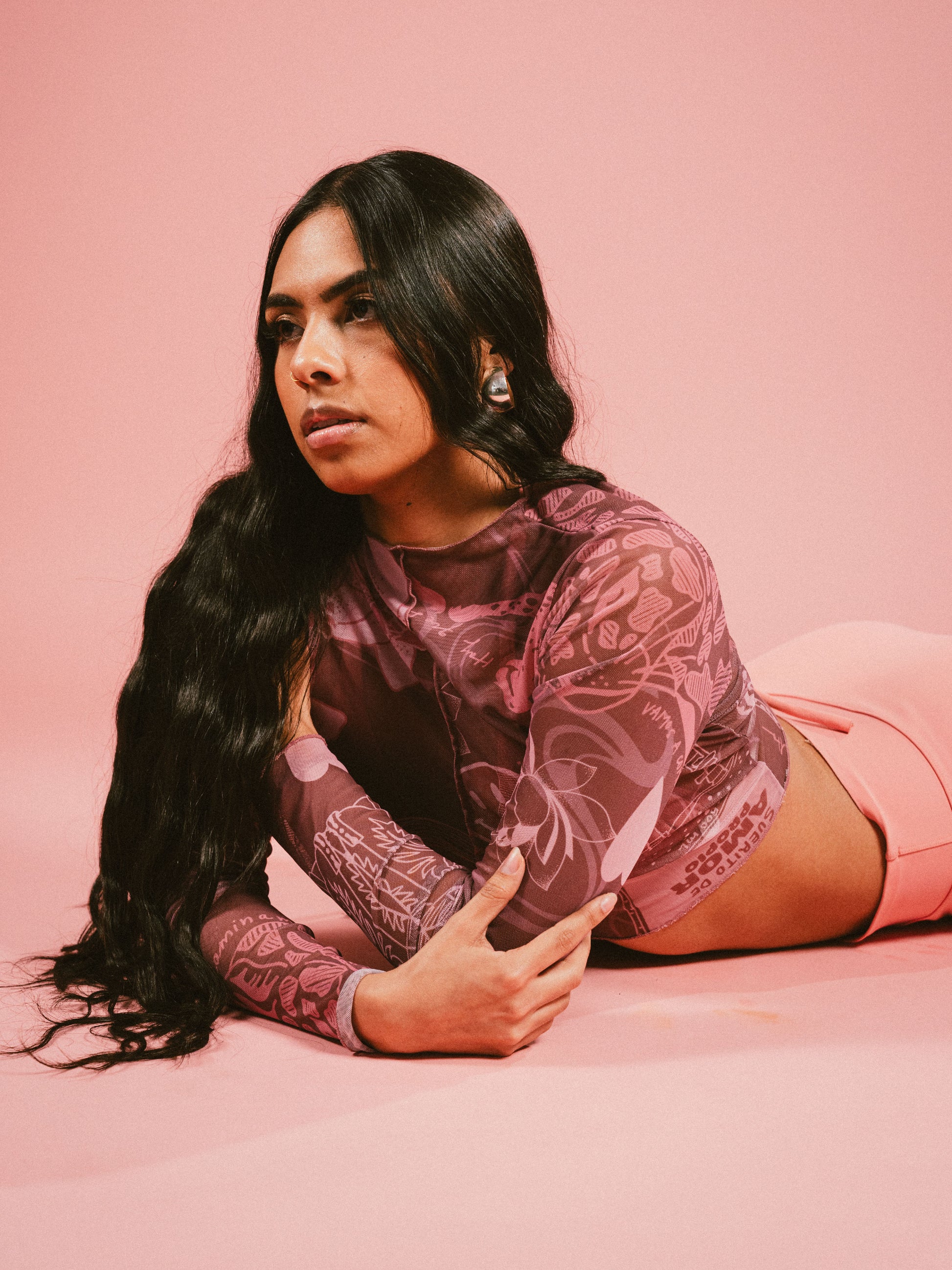Malla tipo crop top con sesgo frontal y corte recto. Con diseños de la carta impresa en rosados