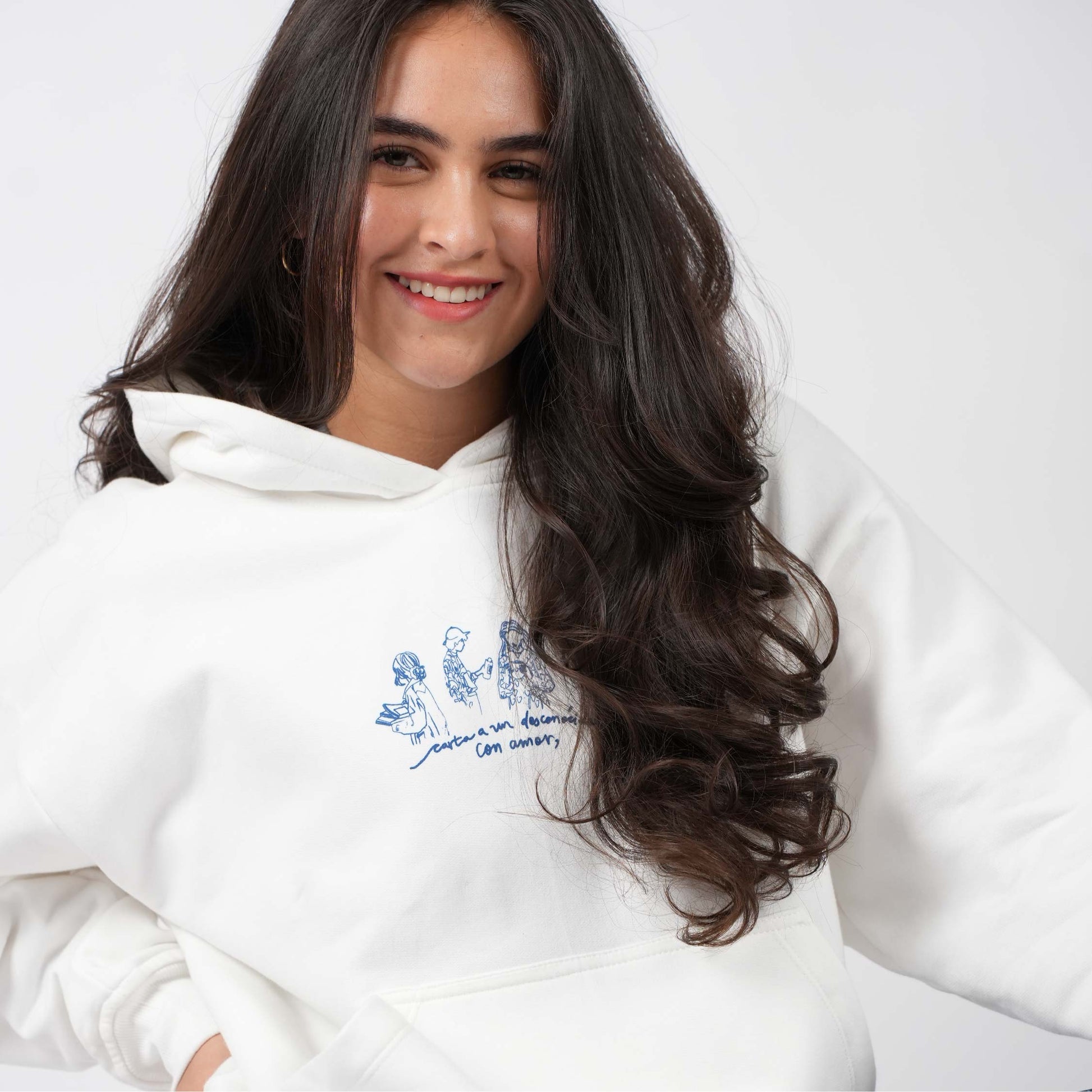 Hoddie color blanco de la carta a un desconocido. En la parte delantera trae estampado con color azul, una ilustración de la colección y atrás el diseño que reúne muchas de las cartas que escribieron desconocidos. Viene con bolsillo delantero, marquilla exterior en la manga. Muy fácil de combinar con toda nuestra colección. Hecha en 100% algodón perchado.