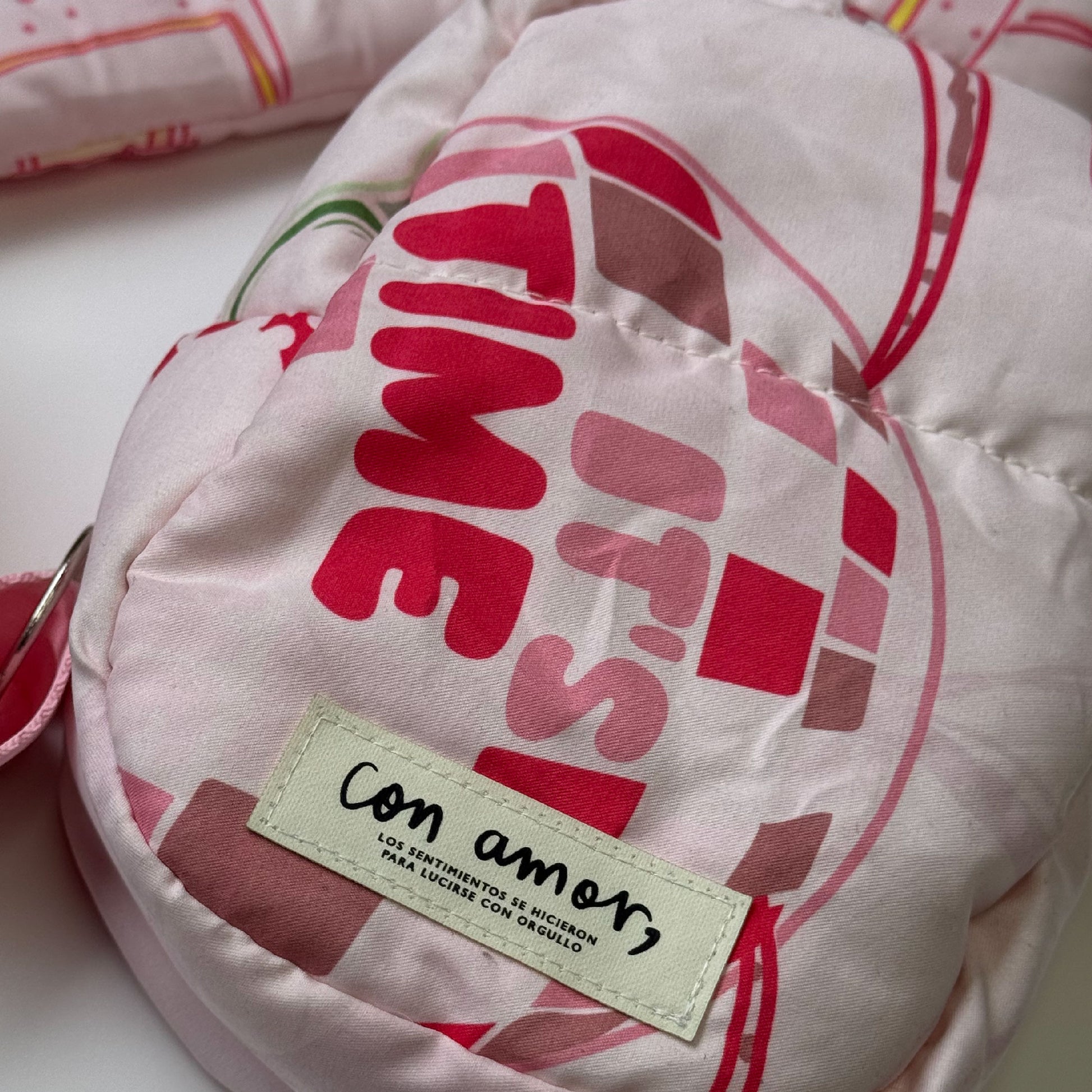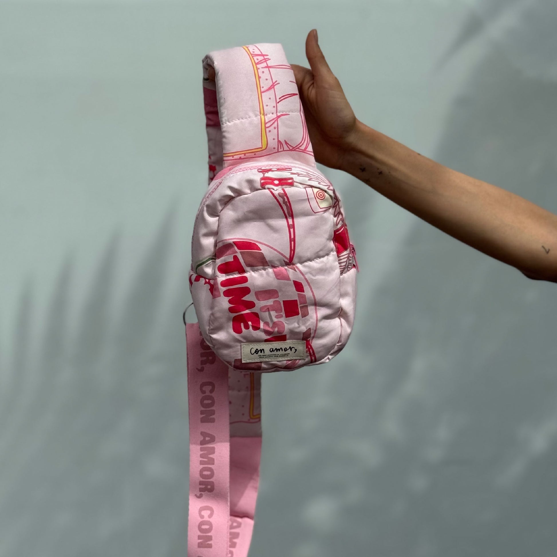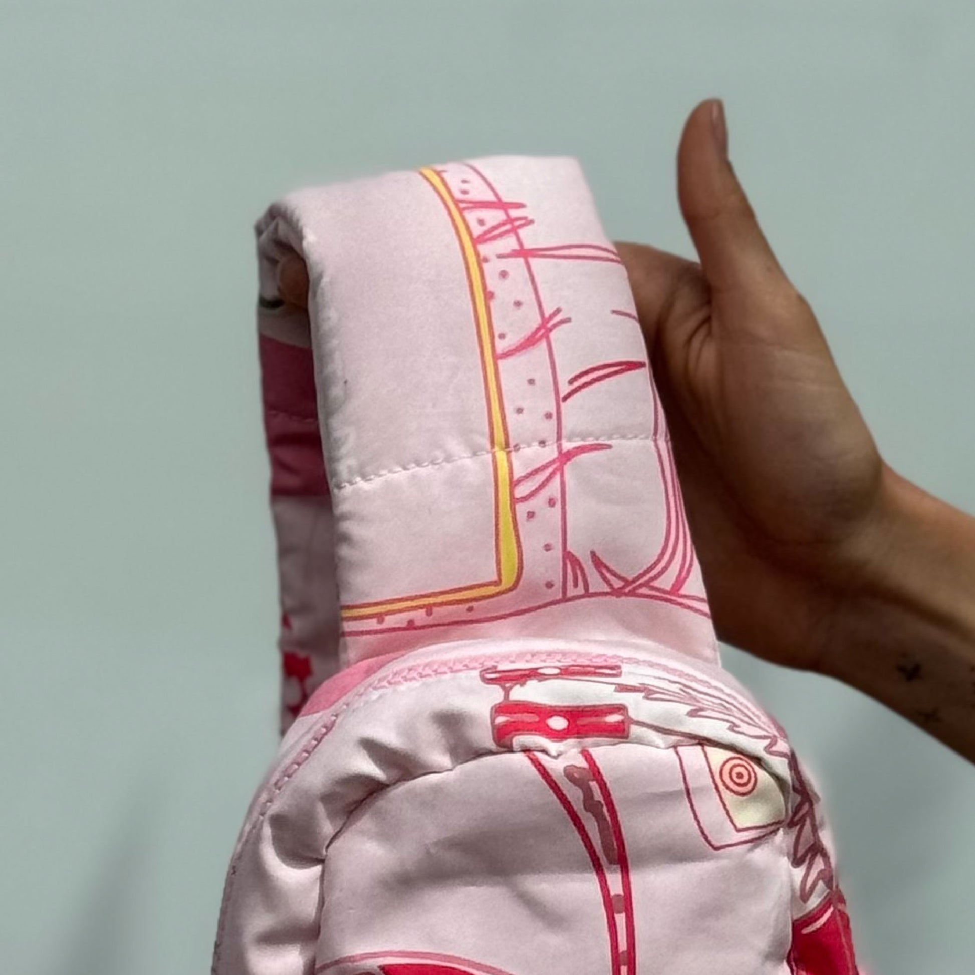 Nace de nuestro primer proyecto upcycling donde rescatamos más del 90% de una producción fallida. Con tela en acabado de piel de durazno y sublimado con nuestra carta de Amor Propio en Rosado combinado.