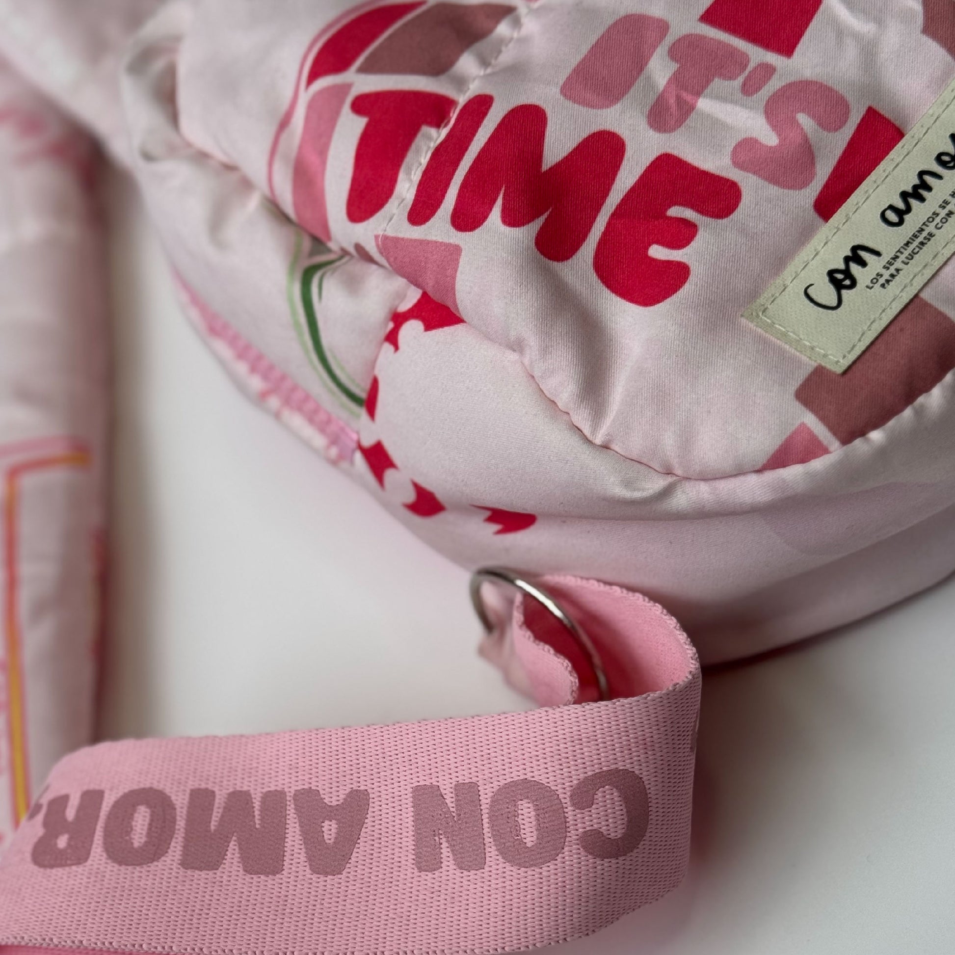 Cremallera rosada, recuperada y una riata con estampado de la marca.