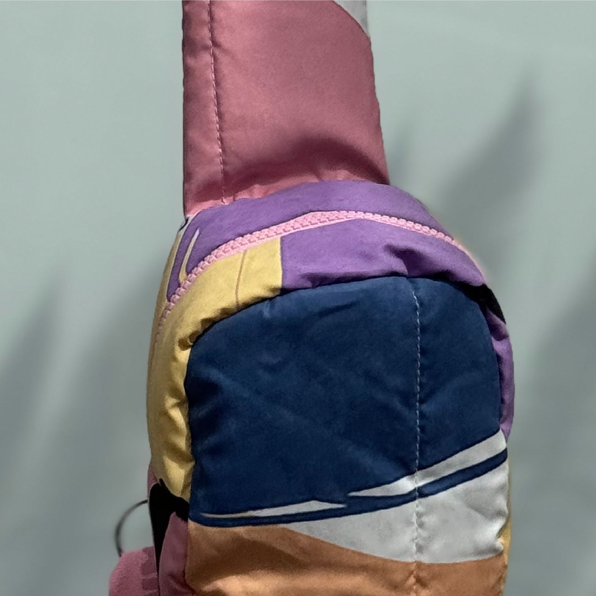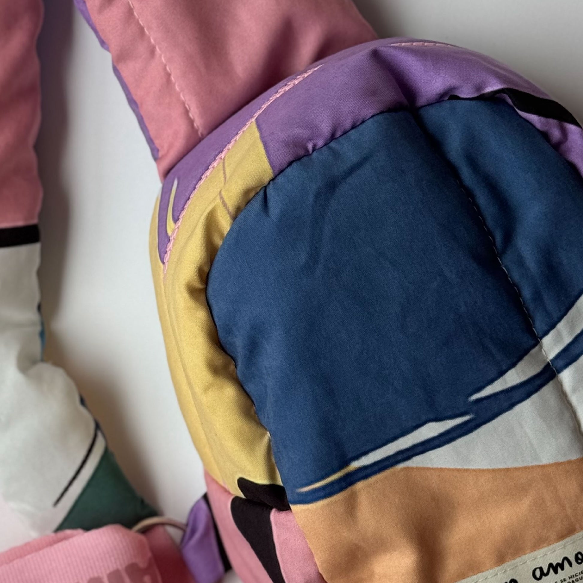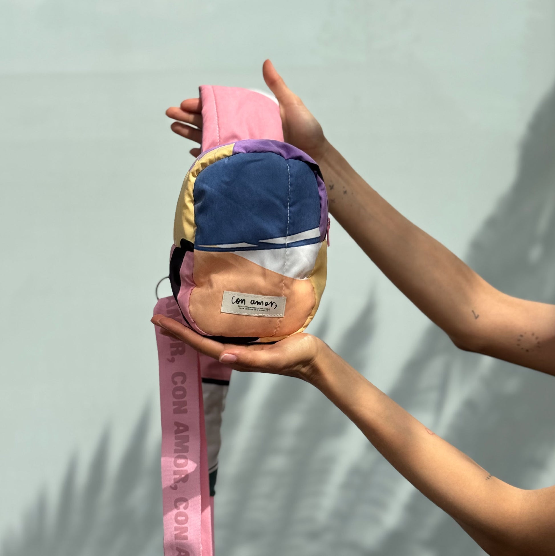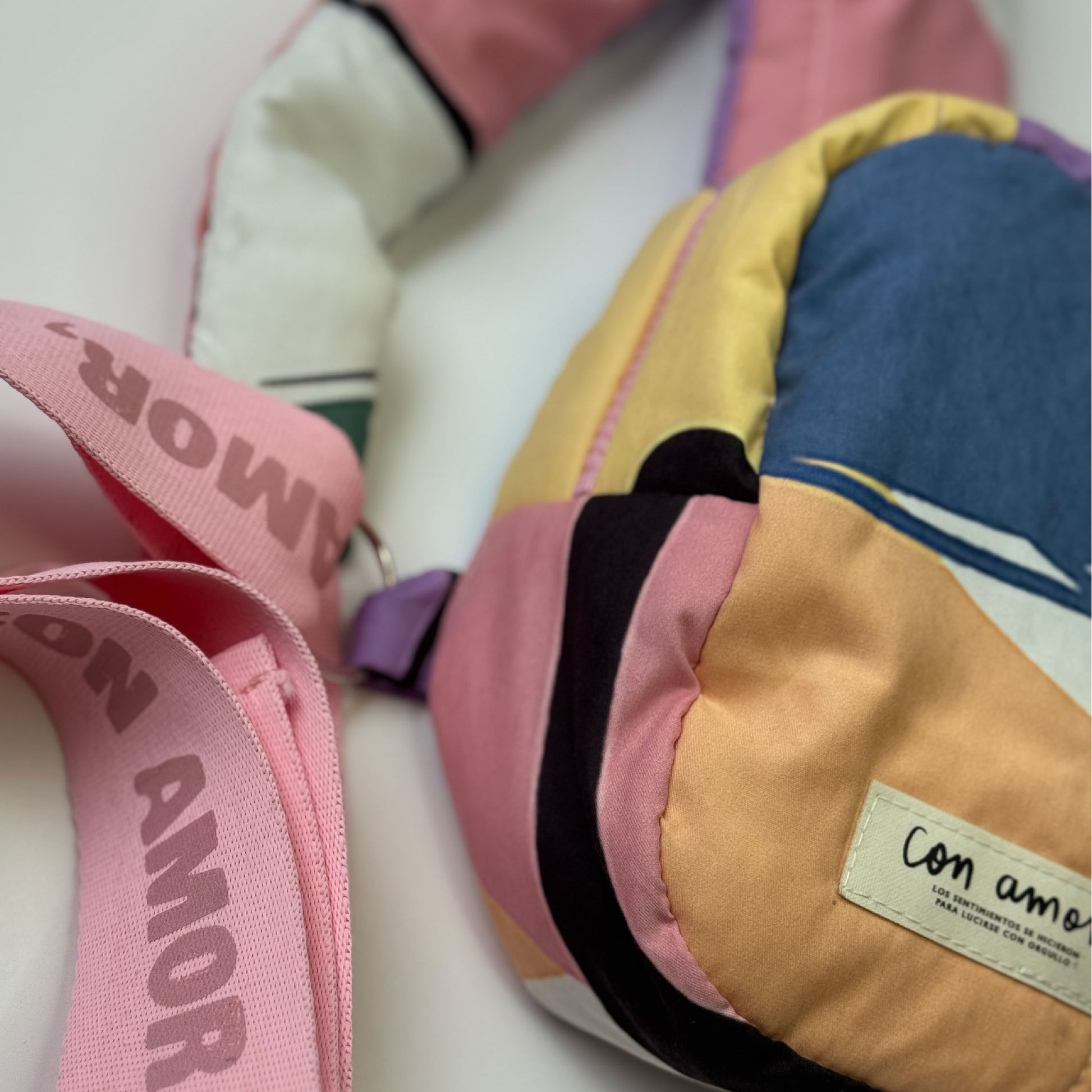 Nace de nuestro primer proyecto upcycling donde rescatamos más del 90% de una producción fallida. Con tela en acabado de piel de durazno y sublimado con nuestra tela icónica de colores.