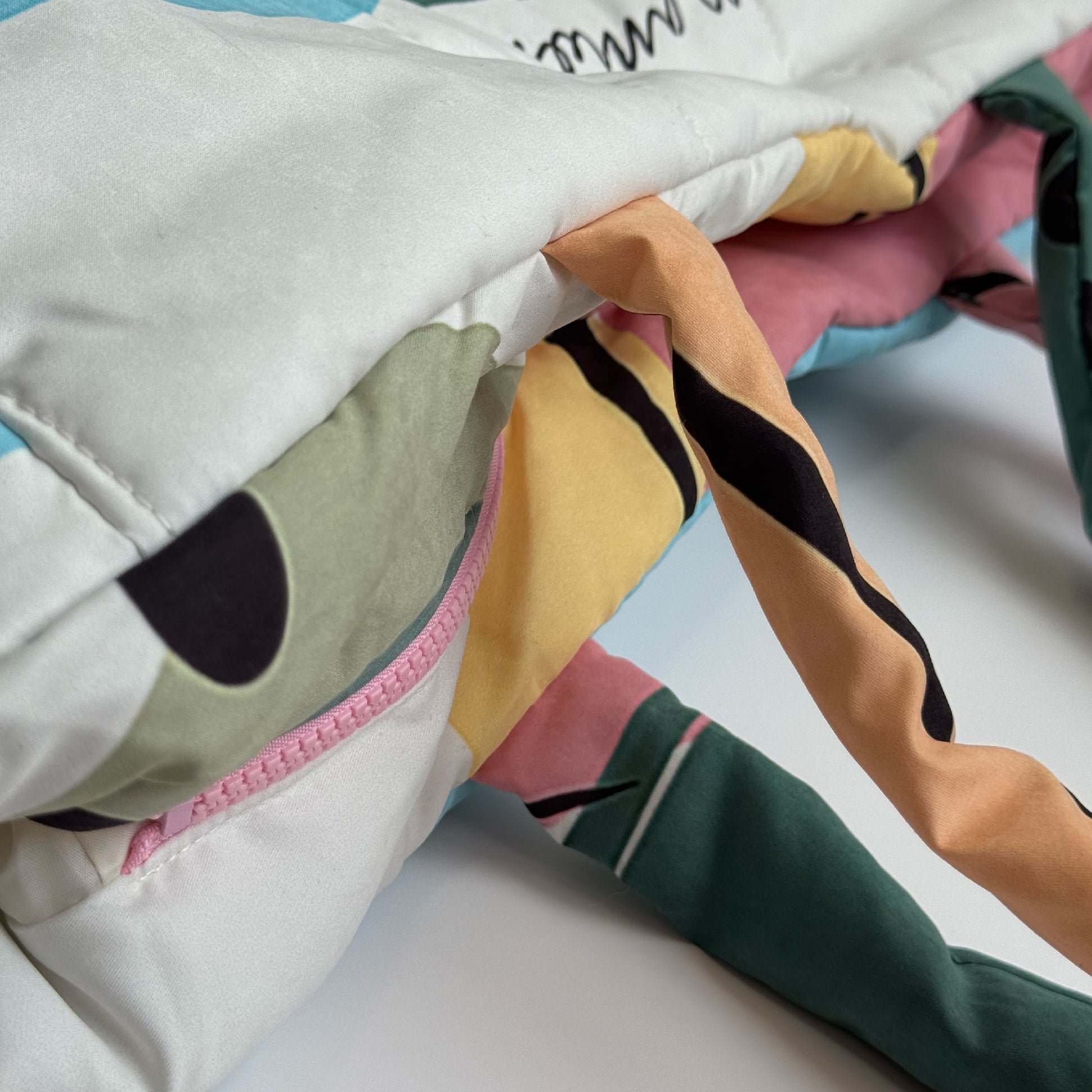 Nace de nuestro primer proyecto upcycling donde rescatamos más del 90% de una producción fallida. Con tela en acabado de piel de durazno y sublimado con nuestra tela icónica de colores.