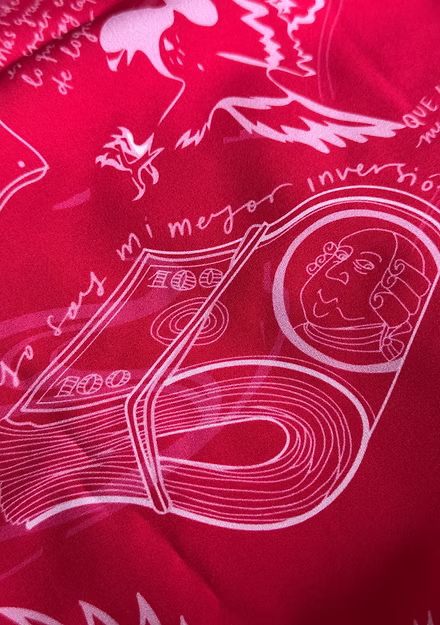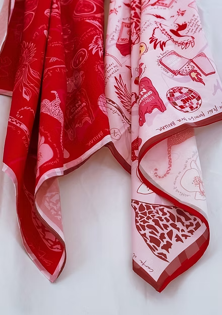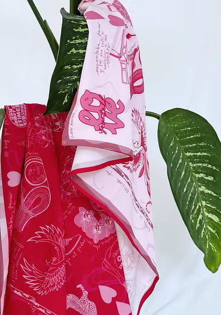 Pañoleta en tela seda poliéster de 70x70 con ilustraciones y cartas de amor propio.