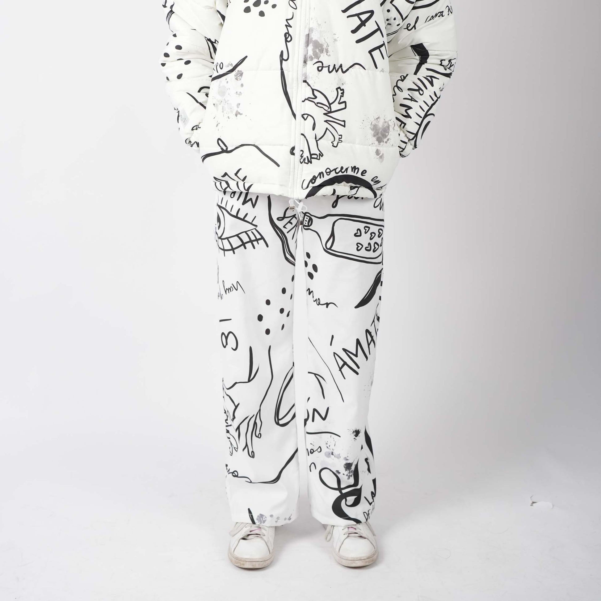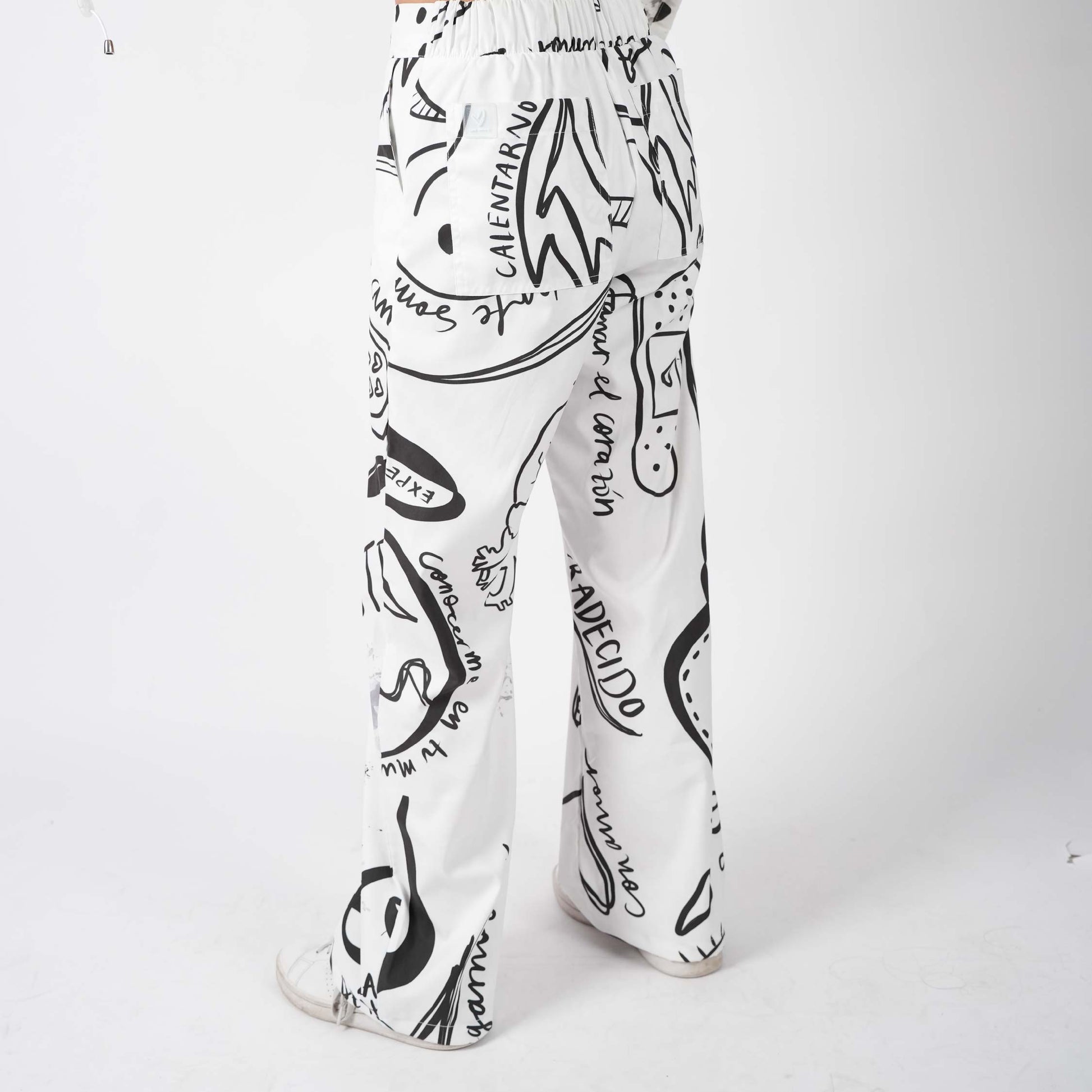 Pantalón Blanco de una carta de amor que nunca entregué. Este pantalón viene con la ilustración de una carta al amor que nunca entregué en tela liviana y muy cómoda. Su base es blanca y con letras en negro. Es apto para llevar en climas fríos y cálidos. Su silueta es recta, pretina en la parte frontal y con un resorte en la parte posterior para mejorar el ajuste. Tiene marquilla en relieve en uno de los bolsillos traseros y lleva bolsillos laterales.