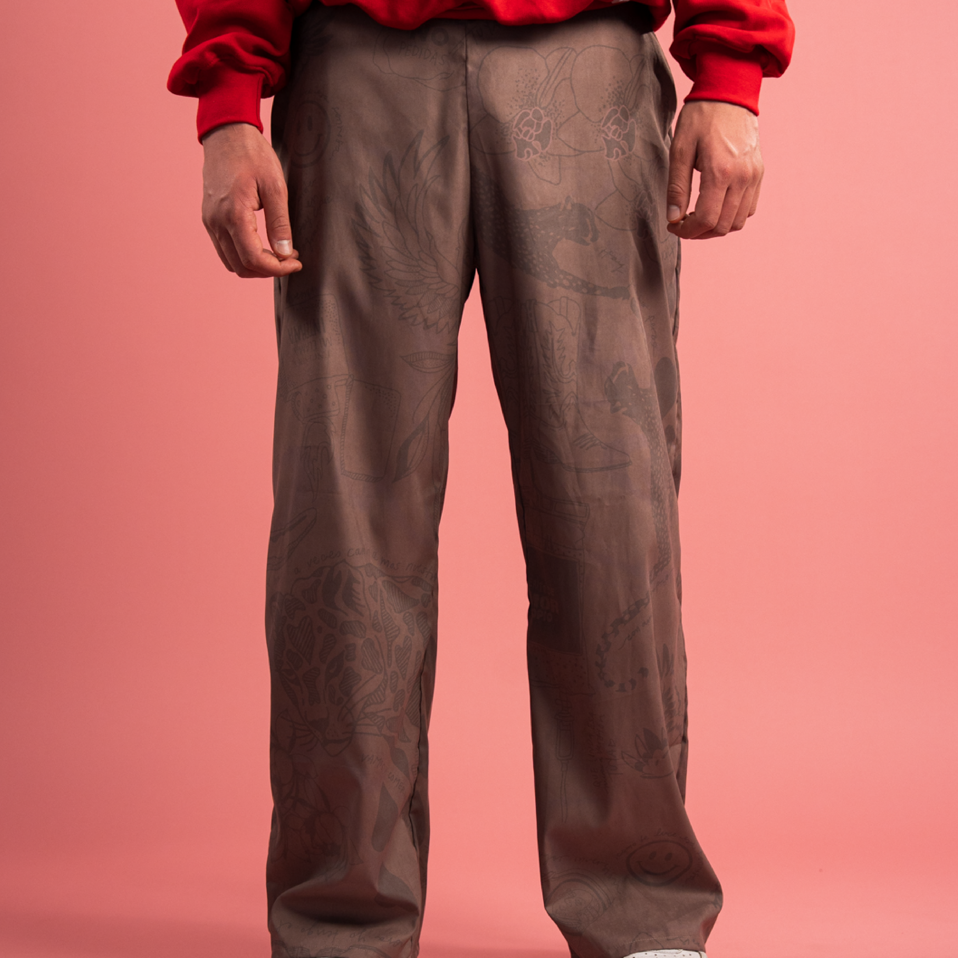 Este pantalón viene con la ilustración de la carta al amor propio impresa en tela liviana y muy cómoda. Su base es café y con letras en un café más oscuro. Es apto para llevar en climas fríos y cálidos. Su silueta es recta, pretina en la parte frontal y con un resorte en la parte posterior para mejorar el ajuste. Tiene marquilla en relieve en uno de los bolsillos traseros y lleva bolsillos laterales.