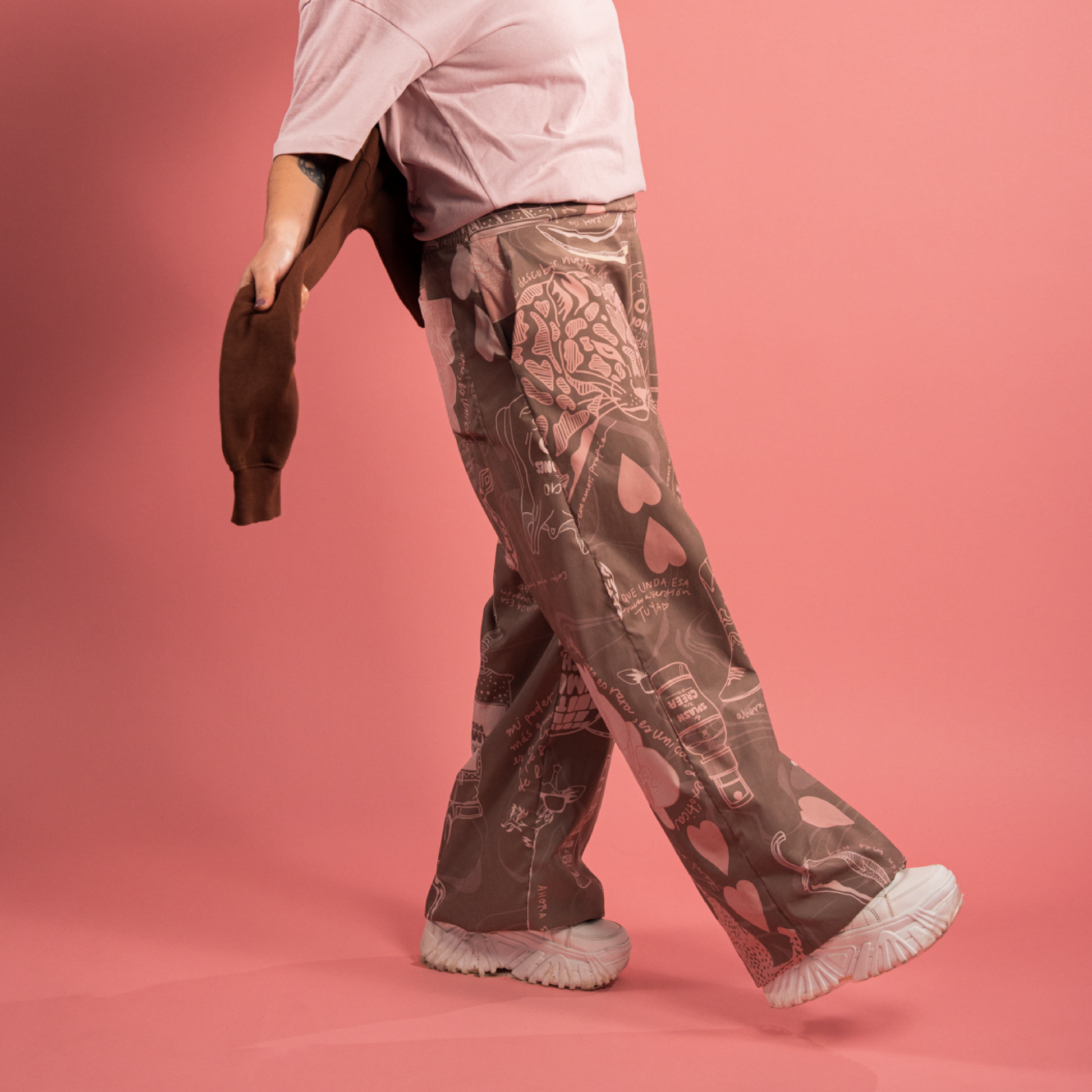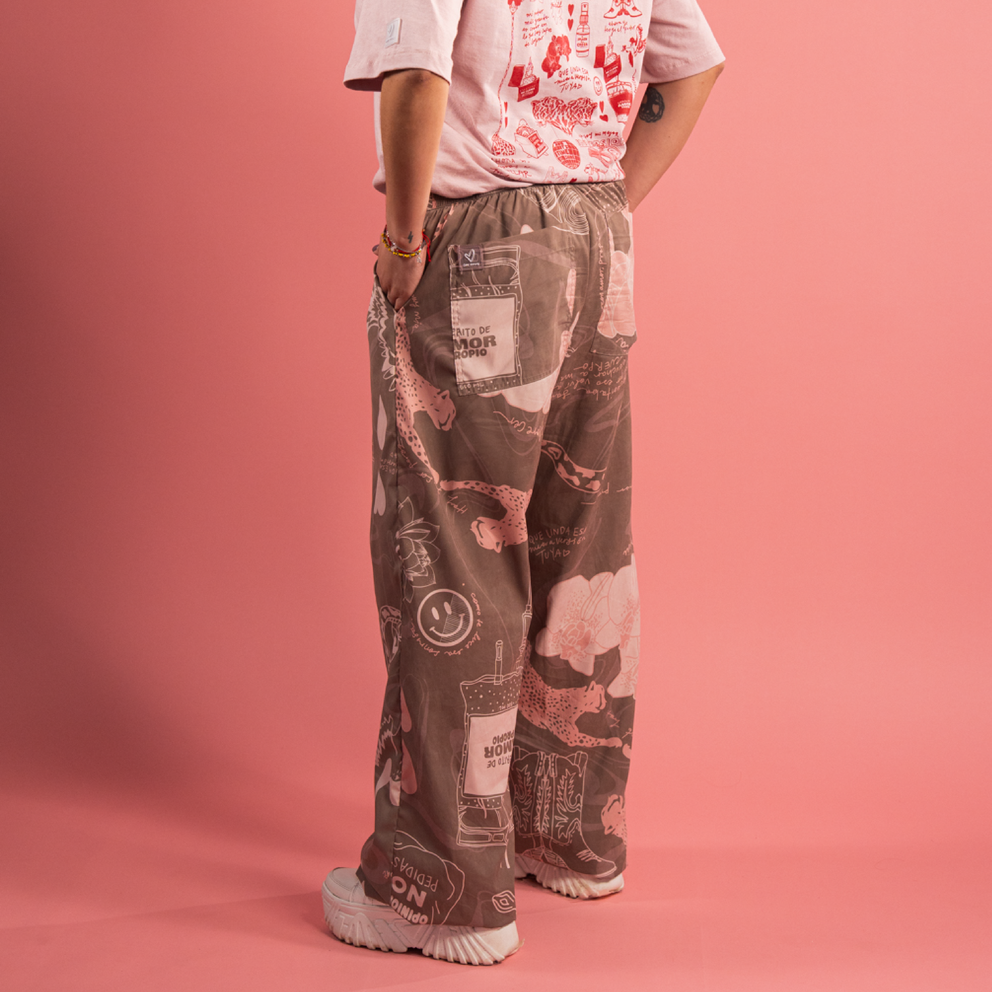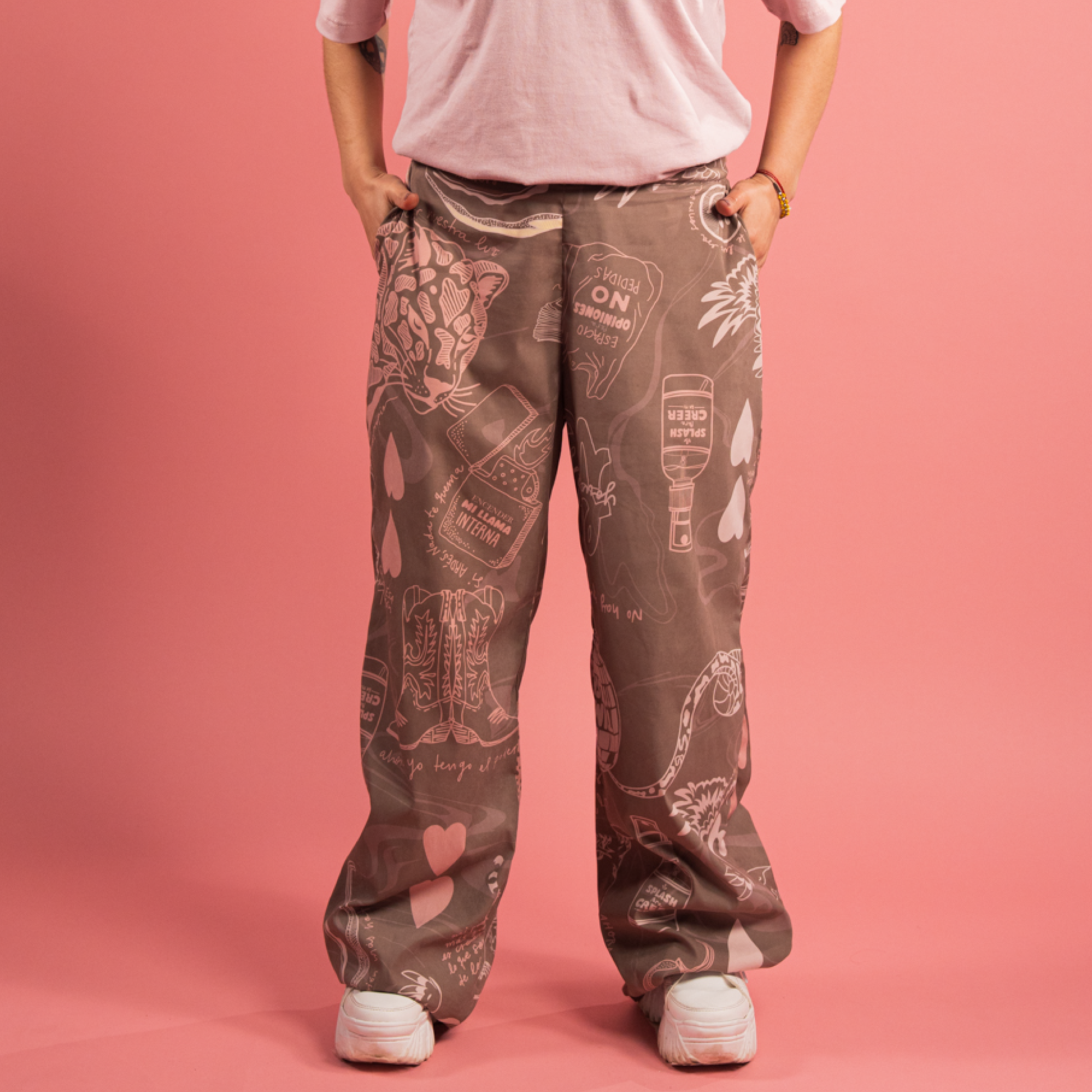 Este pantalón viene con la ilustración de la carta al amor propio impresa en tela liviana y muy cómoda. Su base es café y con letras en distintos tonos de Rosa. Es apto para llevar en climas fríos y cálidos. Su silueta es recta, pretina en la parte frontal y con un resorte en la parte posterior para mejorar el ajuste. Tiene marquilla en relieve en uno de los bolsillos traseros y lleva bolsillos laterales.