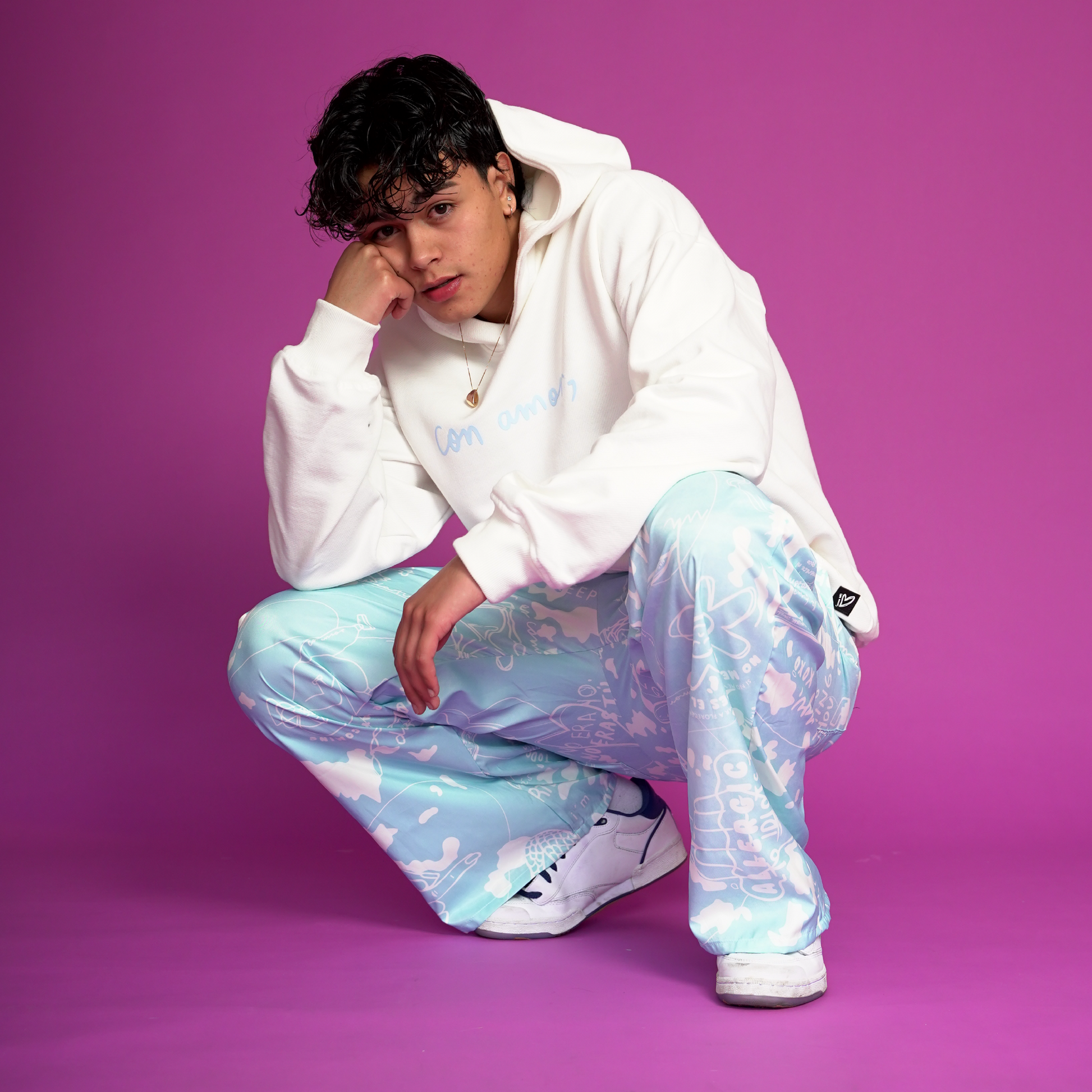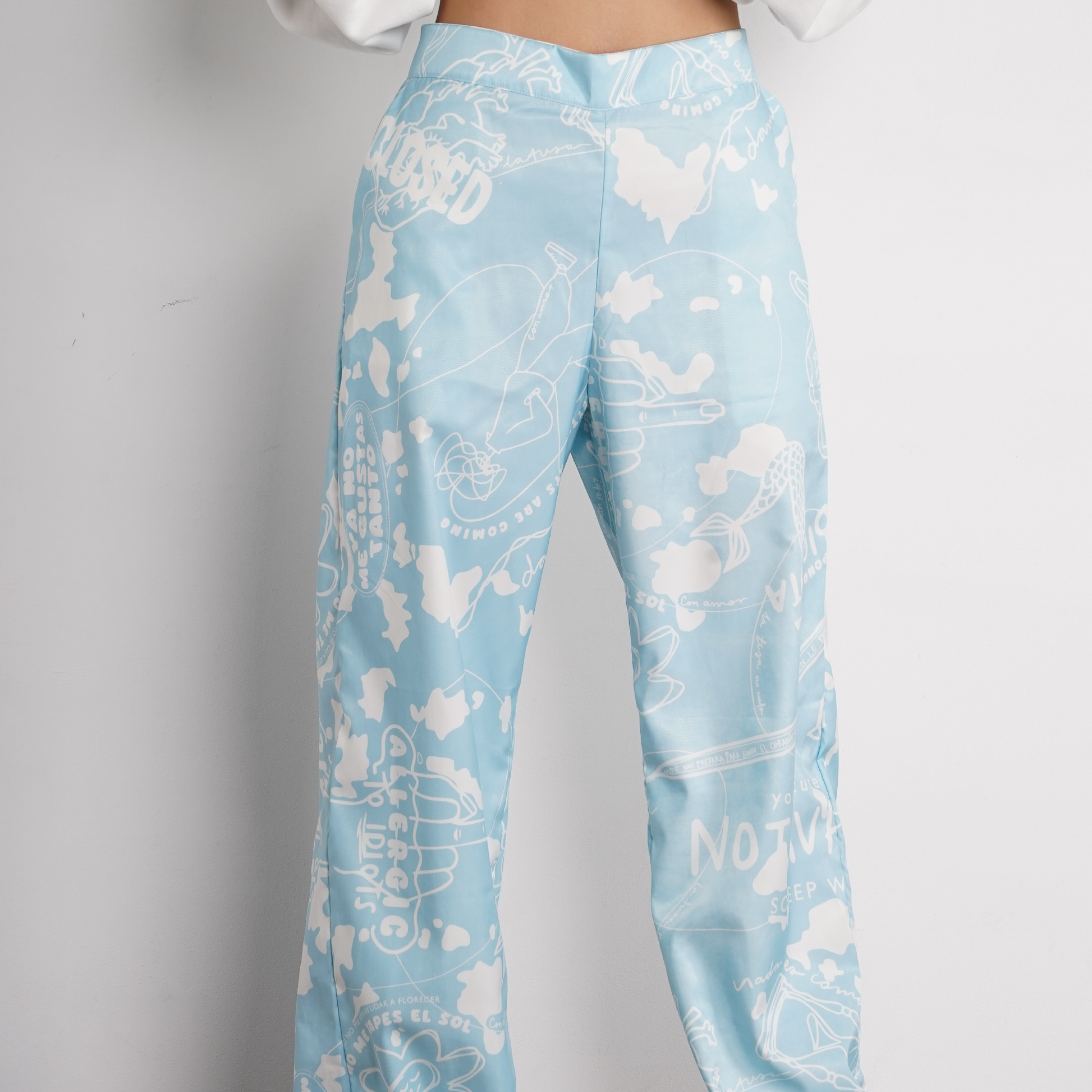 Este pantalón viene con la ilustración de la carta a la tusa impresa en tela liviana y muy cómoda. Su base es gris gastado y con letras en color blanco. Es apto para llevar en climas fríos y cálidos. Su silueta es recta, pretina en la parte frontal y con un resorte en la parte posterior para mejorar el ajuste. Tiene marquilla en relieve en uno de los bolsillos traseros y lleva bolsillos laterales.
