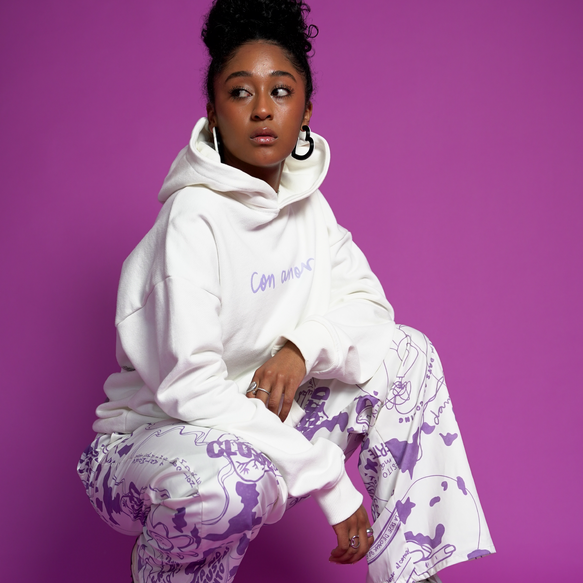 Este pantalón viene con la ilustración de la carta a la tusa impresa en tela liviana y muy comoda. Su base es blanca y con letras en color morado con desgaste. Es apto para llevar en climas fríos y cálidos. Su silueta es recta, pretina en la parte frontal y con un resorte en la parte posterior para mejorar el ajuste. Tiene marquilla en relieve en uno de los bolsillos traseros y lleva bolsillos laterales.