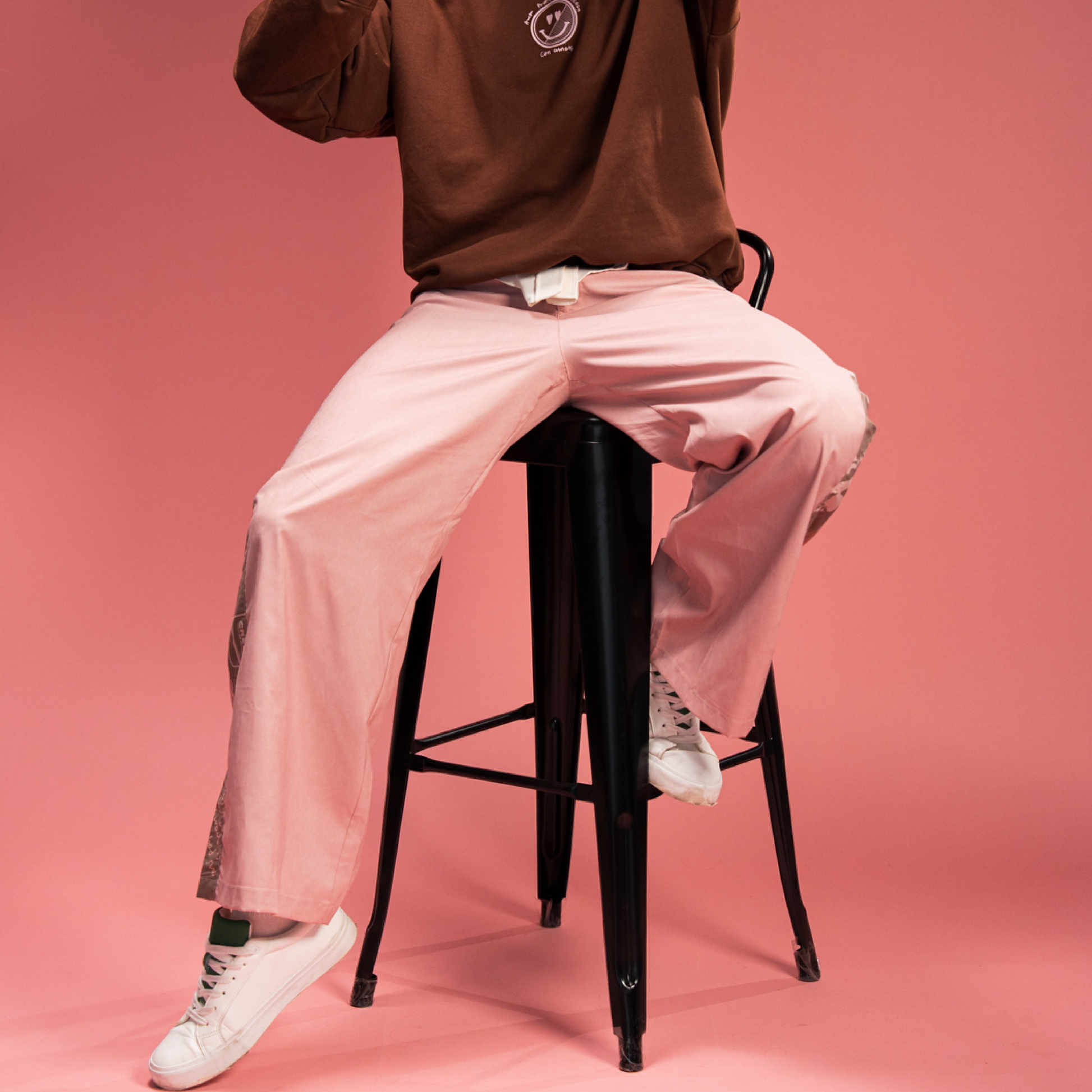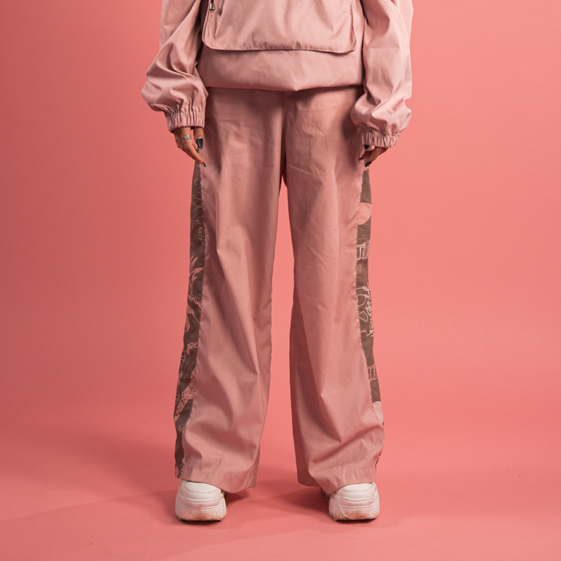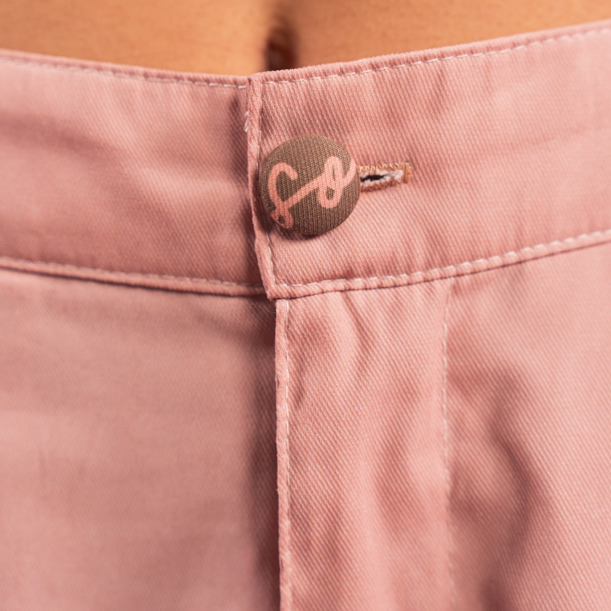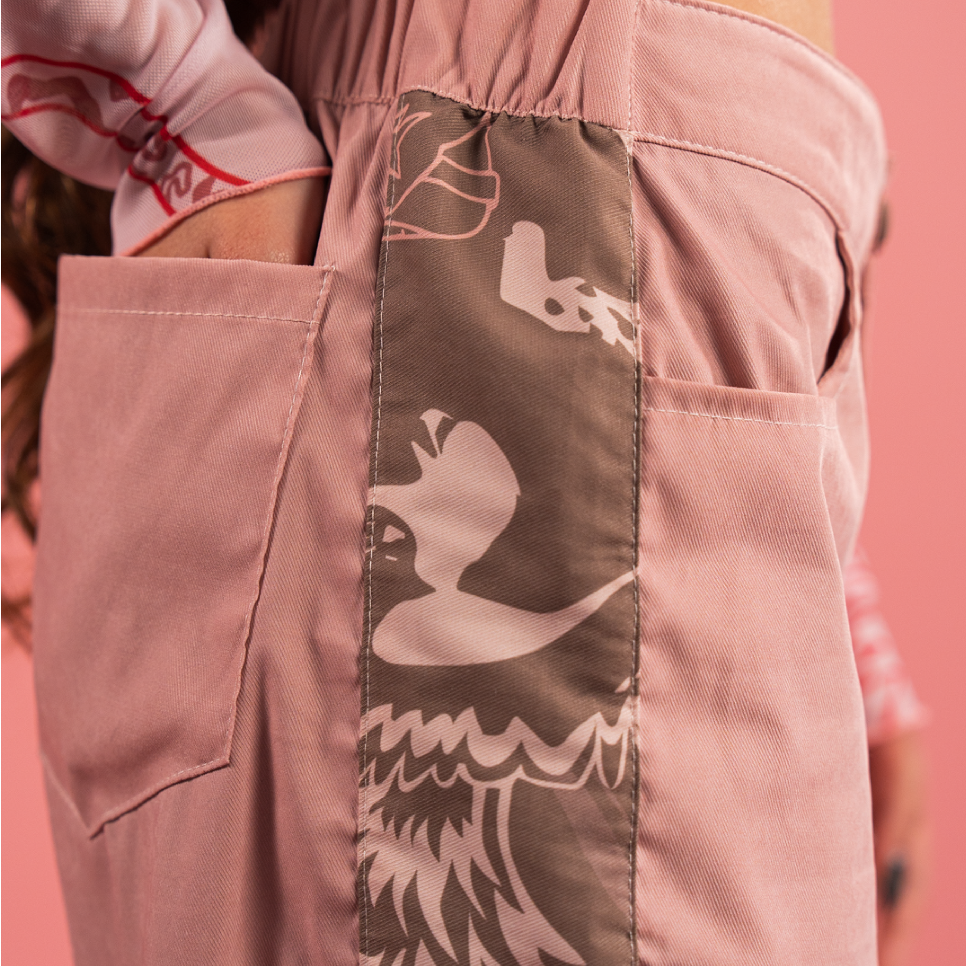 Este pantalón viene con la ilustración de la carta al amor propio impresa en tela liviana y muy cómoda. Su base es Palo rosa y tiene en el costado una franja de la carta en café y rosados. Es apto para llevar en climas fríos y cálidos. Su silueta es recta, pretina en la parte frontal con botón y cremallera, y con un resorte en la parte posterior para mejorar el ajuste. Tiene marquilla en relieve en uno de los bolsillos traseros y lleva bolsillos laterales.