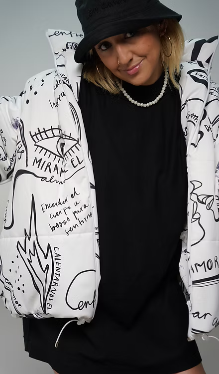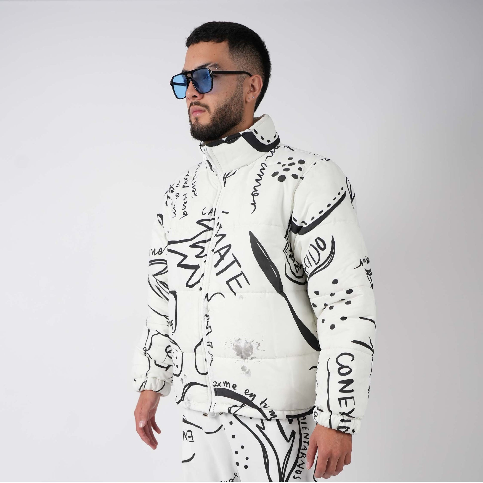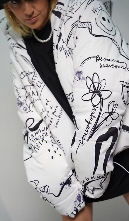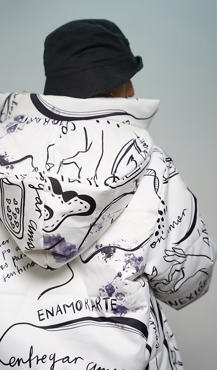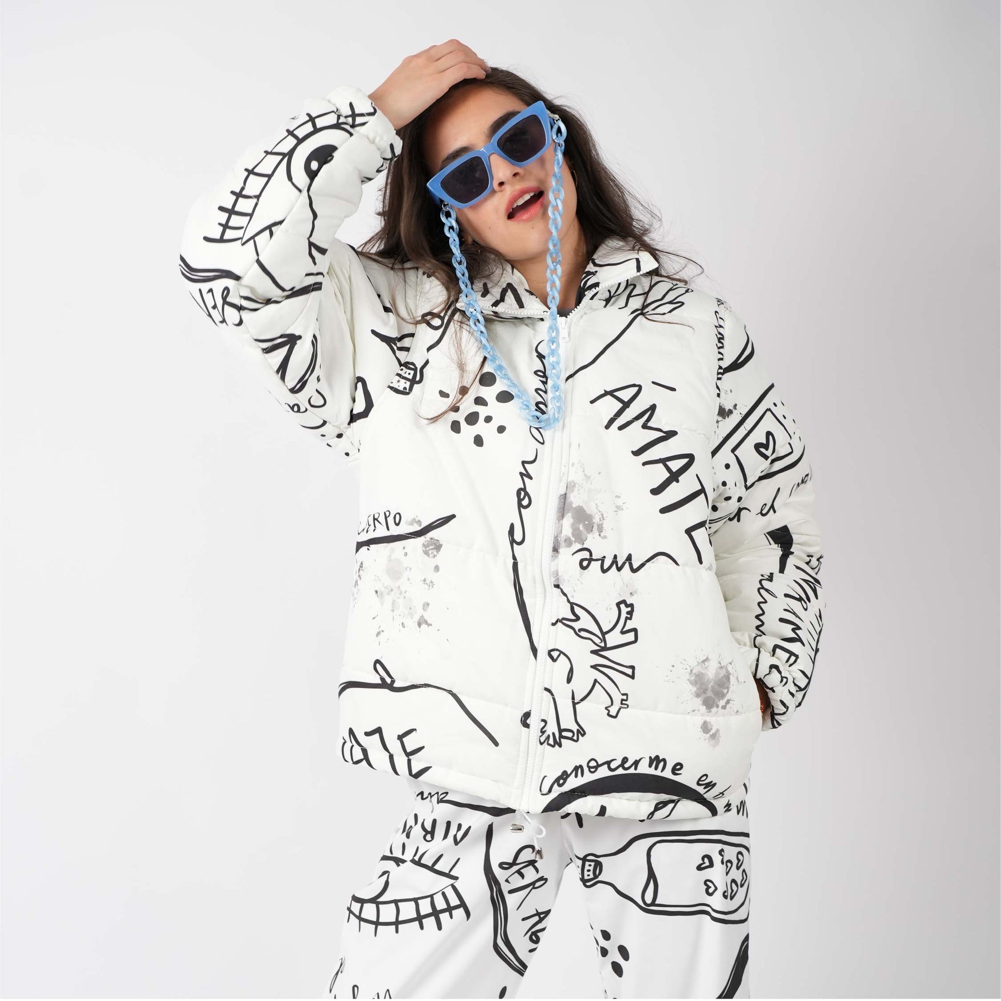Chaqueta en Puffer Blanca con la ilustración de la carta que nunca entregué en tela prada.