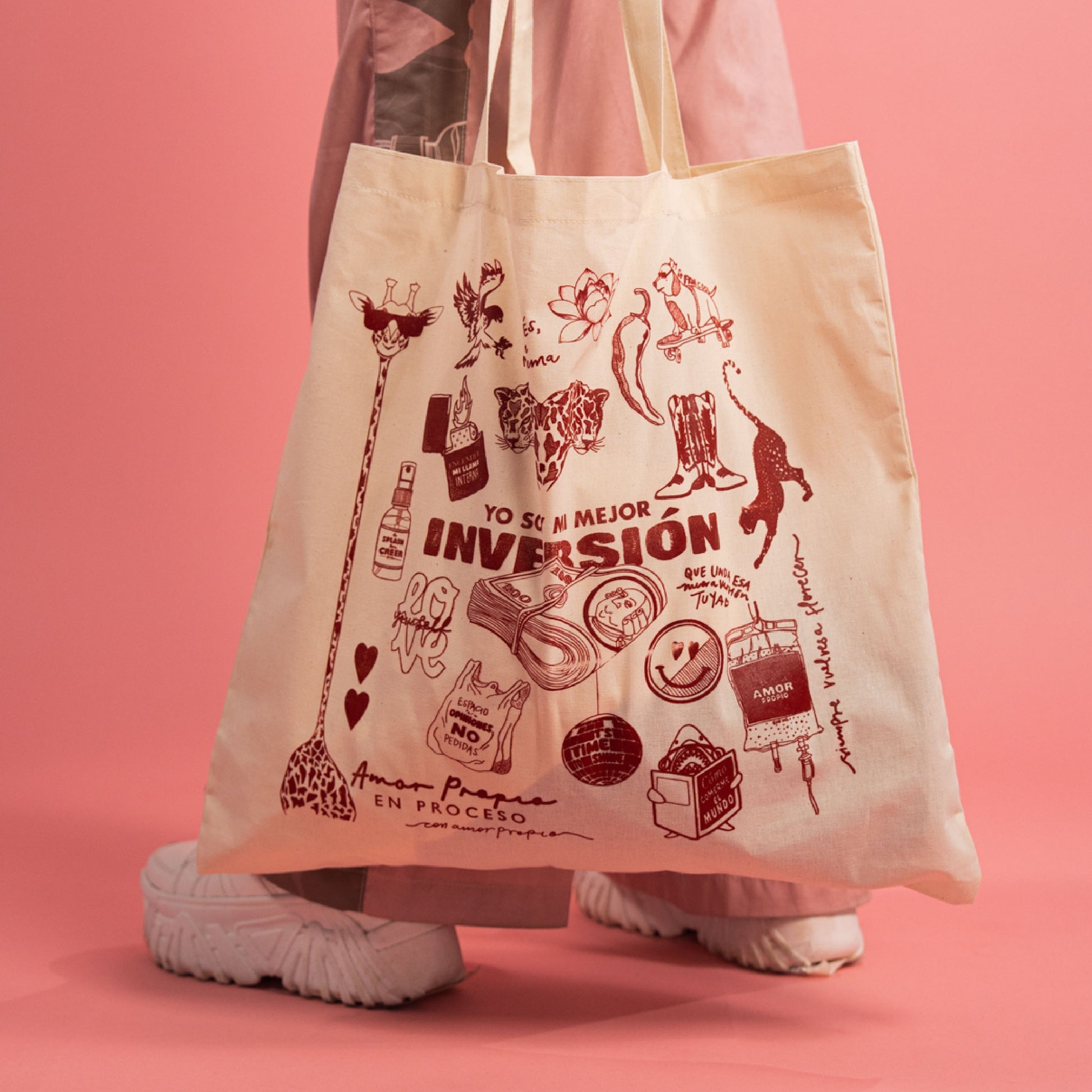 Tote bag sencillo en liencillo con estampado de la colección en rojo.