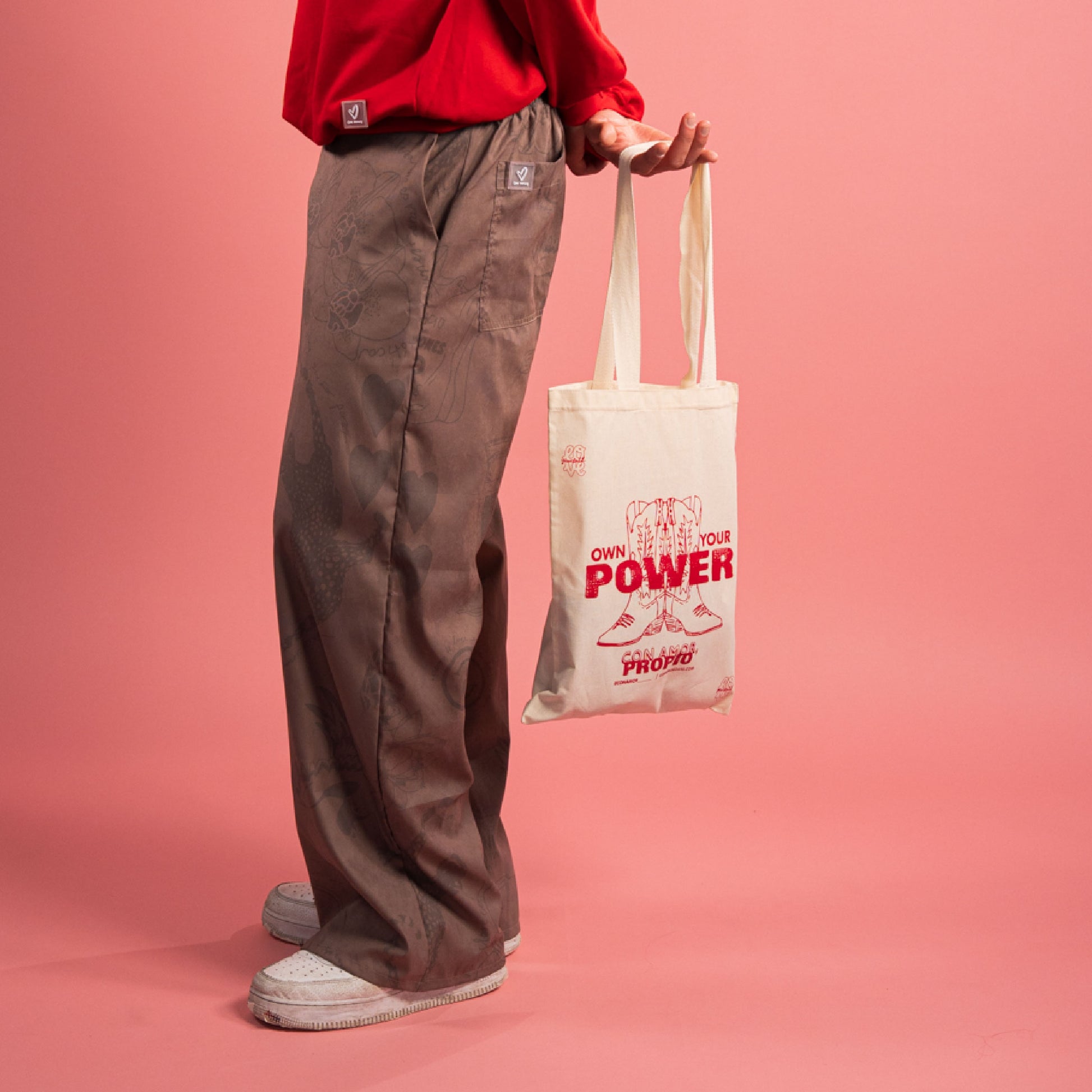 Tote bag sencillo en liencillo con estampado de la colección en rojo.